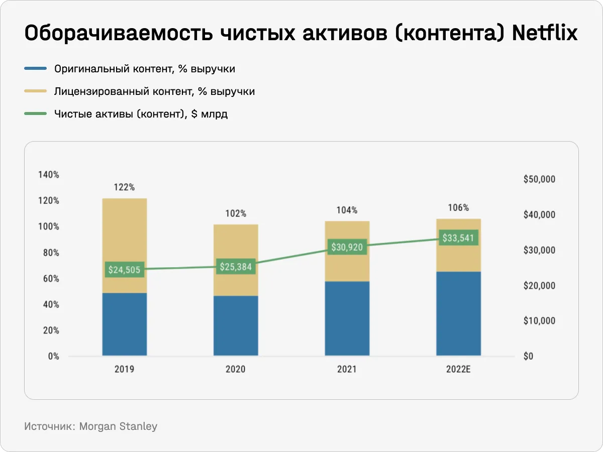 При этом удельная эффективность трат на контент снижается. Даже Netflix, который показывает лучшие результаты по операционной эффективности и вовлечению пользователей, не может существенно увеличить эффективность монетизирования контента, отмечают аналитики Morgan Stanley (MS). Оборачиваемость активов (asset turnover, отношение выручки к активам), которая напрямую влияет на показатели операционной рентабельности, не растет.