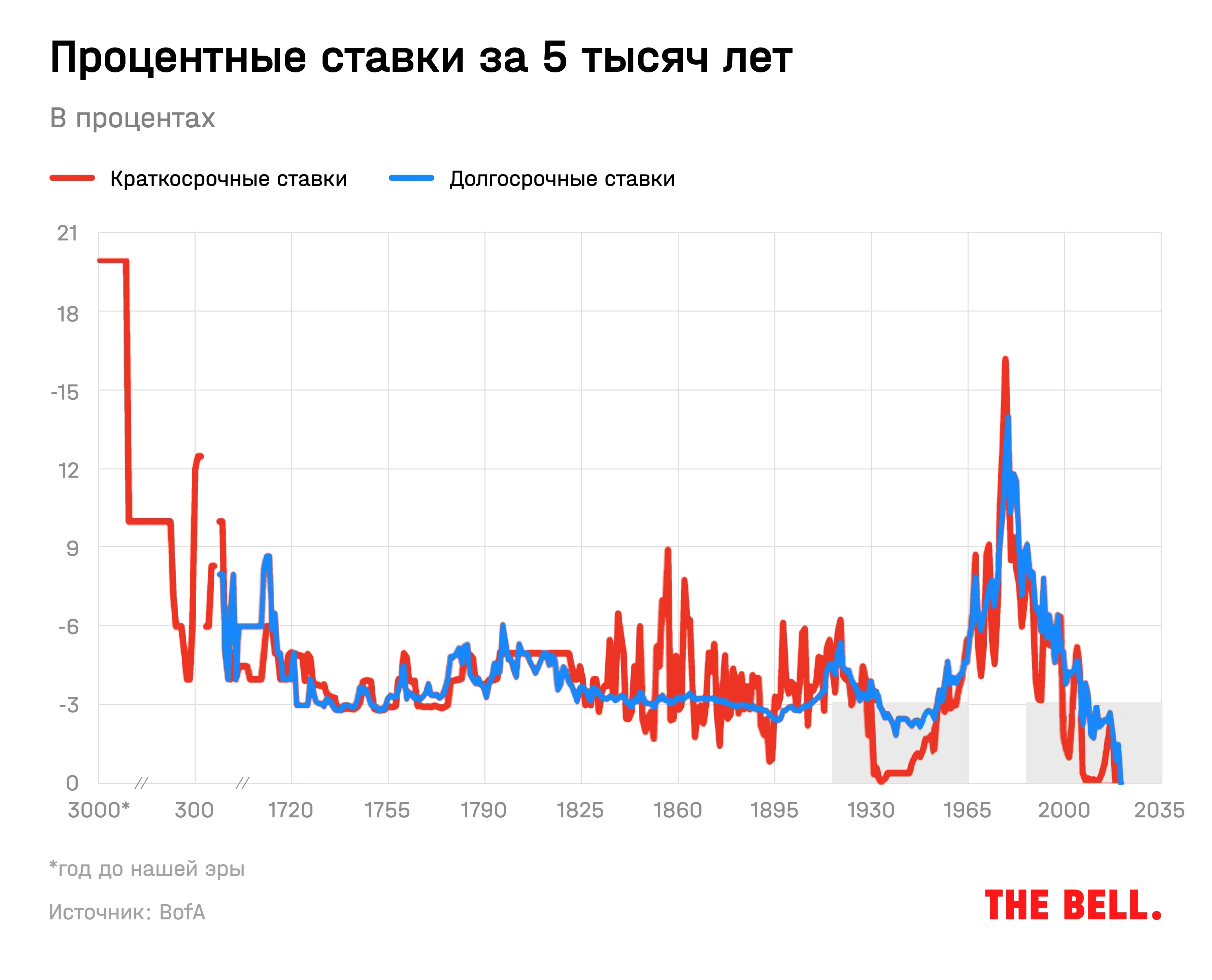 «Мы выходим из эпохи устойчиво низких ставок», — заявил Джеффри Розенберг, портфельный управляющий BlackRock в интервью Bloomberg Surveillance. Такими низкими, как сейчас, ставки не были по крайней мере пять тысяч лет, говорится в отчете Bank of America (есть у The Bell).