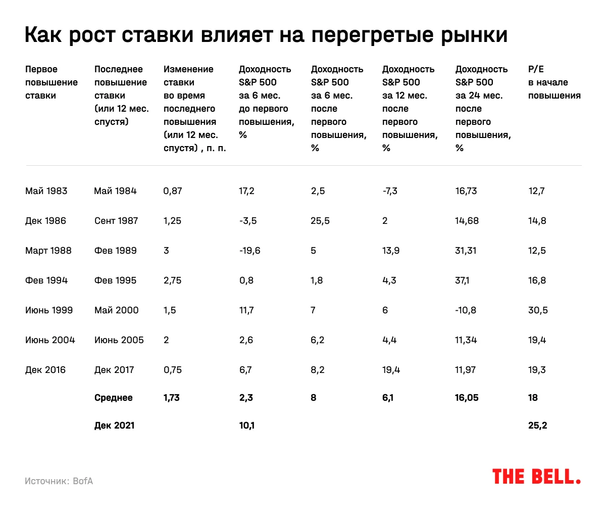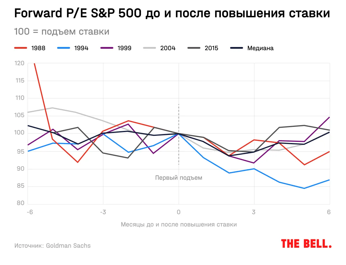 Начиная с осени (то есть того момента, когда рынки начали волноваться о ставках, отмечают в Blackrock) западные инвестбанки включают в свои отчеты главы с историческими сравнениями с предыдущими циклами повышения ставки. В Goldman Sachs показывают, что в последние пять циклов повышения ставки (начиная с 1988 года) оценка рынков по показателю «прибыль/цена» на ближайший год оставалась неизменной в течение полугода до и после первого повышения ставки. Иными словами, все зависело от прибыли компаний. О стратегии инвестбанка на 2022 год мы рассказывали здесь.