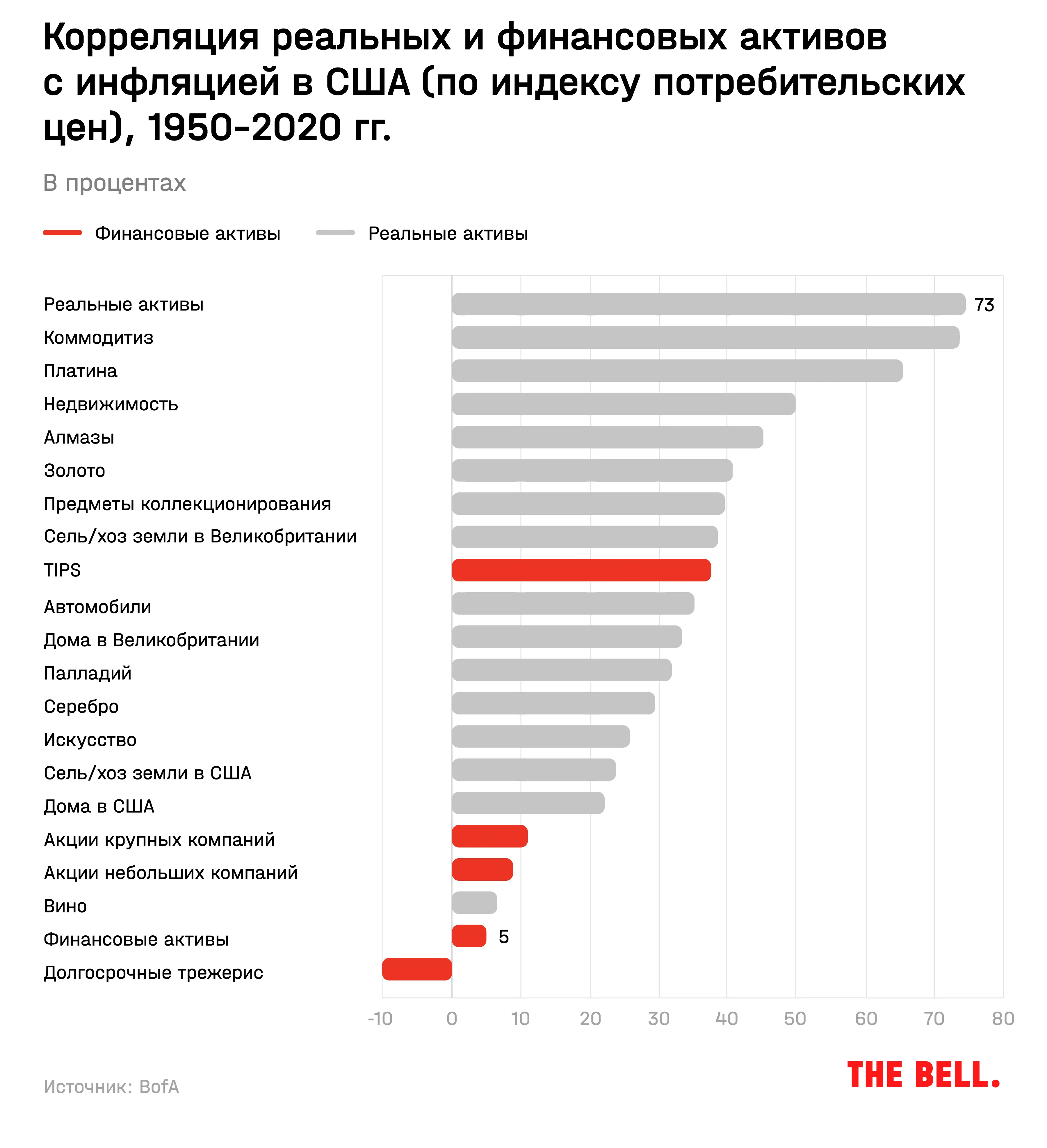 Реальные активы сейчас стоят максимально дешево по сравнению с финансовыми с 1925 года и могут рассматриваться как хедж против роста инфляции. Кроме них, в