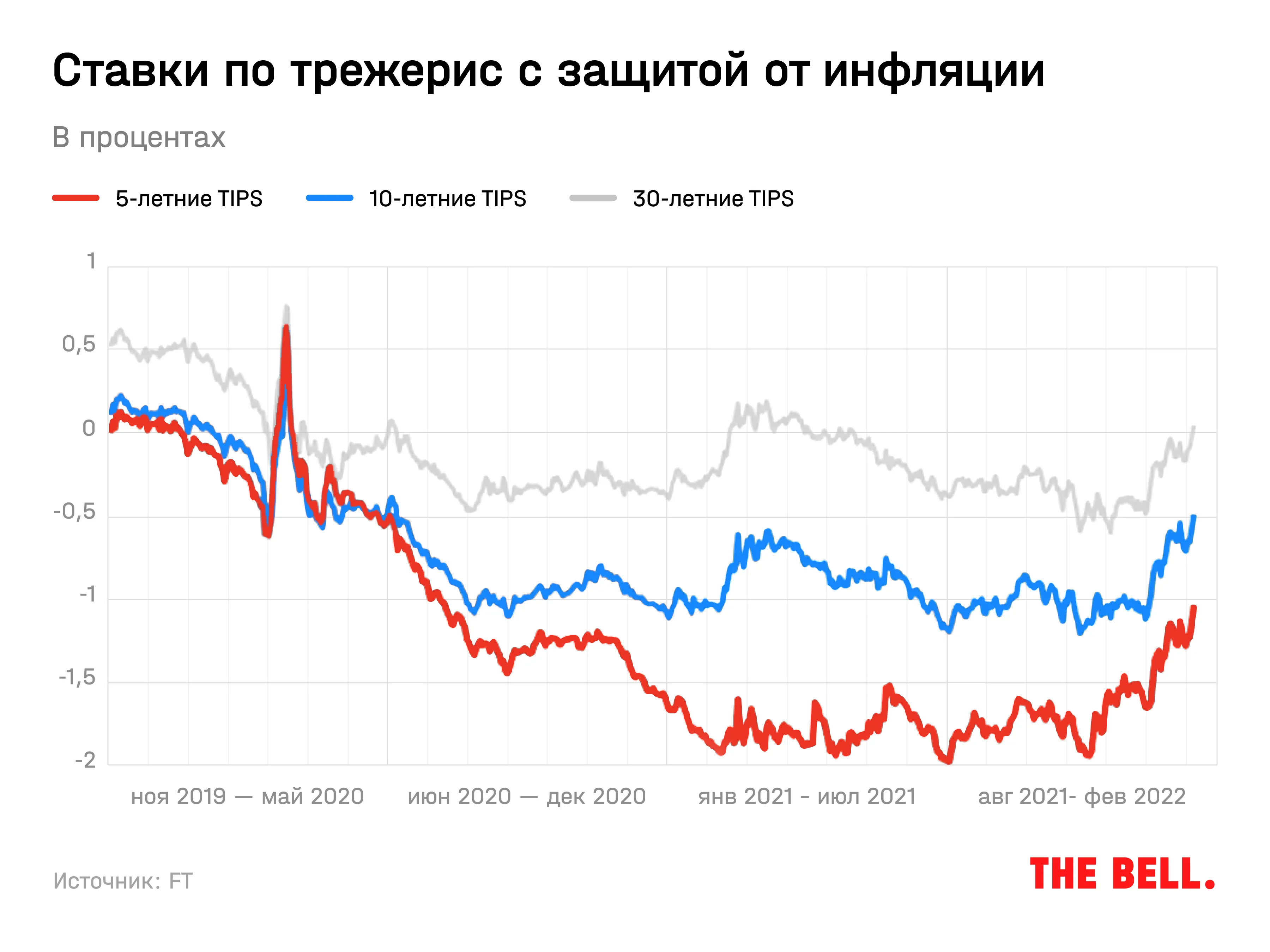 Ставки по 30-летним казначейским облигациям с плавающим купоном (TIPS) — прокси на реальные (то есть с учетом инфляции) ставки по 30-летним трежерис — впервые с мая 2021 года вышли в положительную зону. В начале года они еще составляли минус 0,47% годовых. Ставки по пяти- и десятилетним TIPS, несмотря на рост, все еще остаются отрицательными.