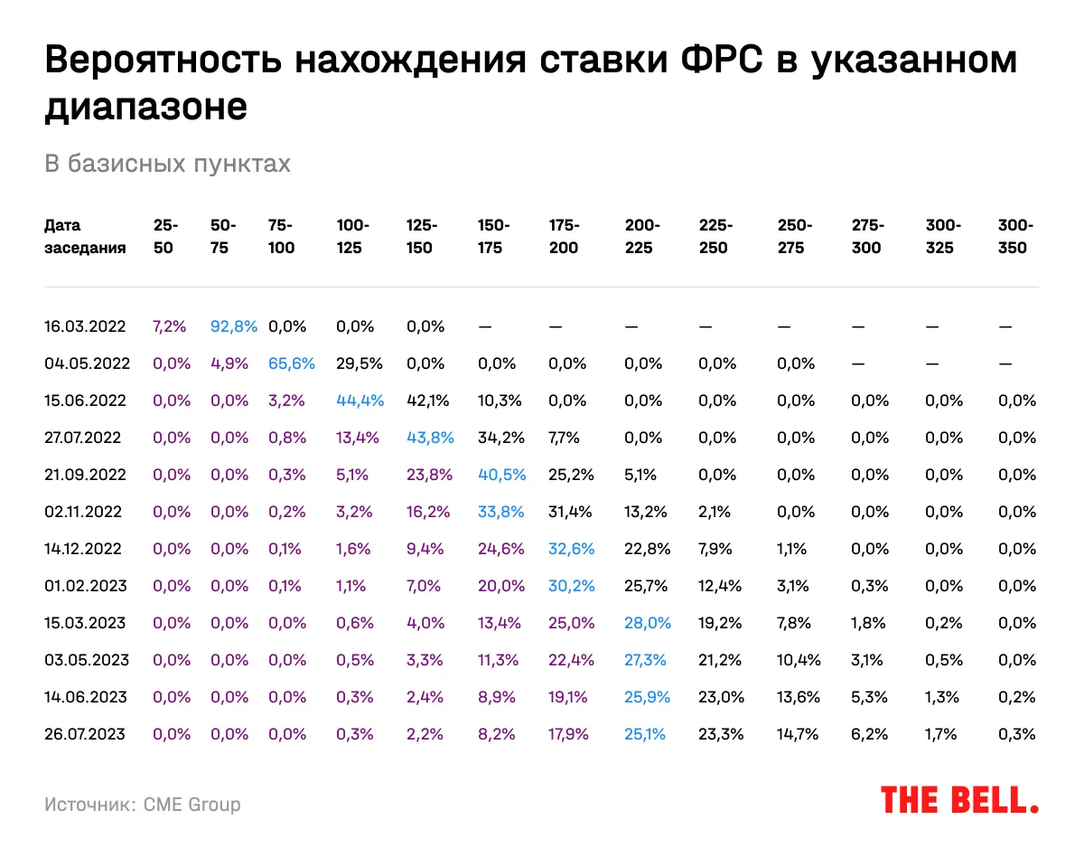Самый важный вопрос сейчас — максимальный уровень ставки (terminal rate), до которого центральные банки и прежде всего ФРС будут поднимать ставки, пишет Bloomberg. По состоянию на утро пятницы рынки свопов ожидают, что в 2022 году регулятор поднимет ставки на семь шагов (еще в среду рынки прогнозировали шесть), а в конце года ставка будет находиться в диапазоне 1,75–2% (сейчас — 0–0,25%). А также — что выше 2–2,25% ФРС поднимать ставку не будет.