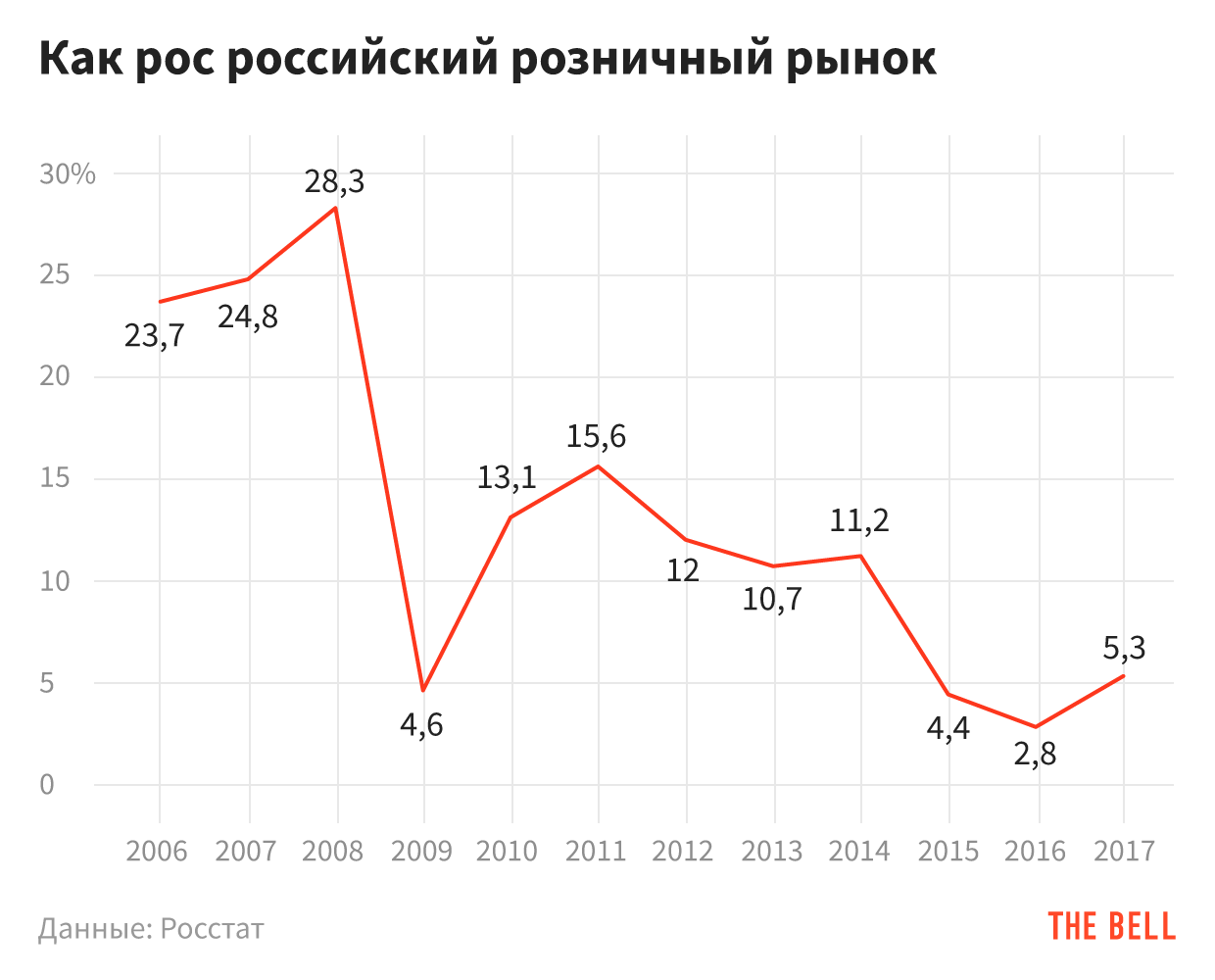 - В Россию Media Markt вышел в 2006 году. Тогда на рынке электроники ритейлера ждали примерно так же, как на продуктовом — несостоявшегося прихода Wal-Mart. Но российский бизнес у Media Markt не задался. За последние пять лет, по оценкам аналитиков, компания понесла в России 13 млрд убытков. Это неудивительно: после присоединения Крыма и введения санкций рост российского розничного рынка замедлился втрое.
