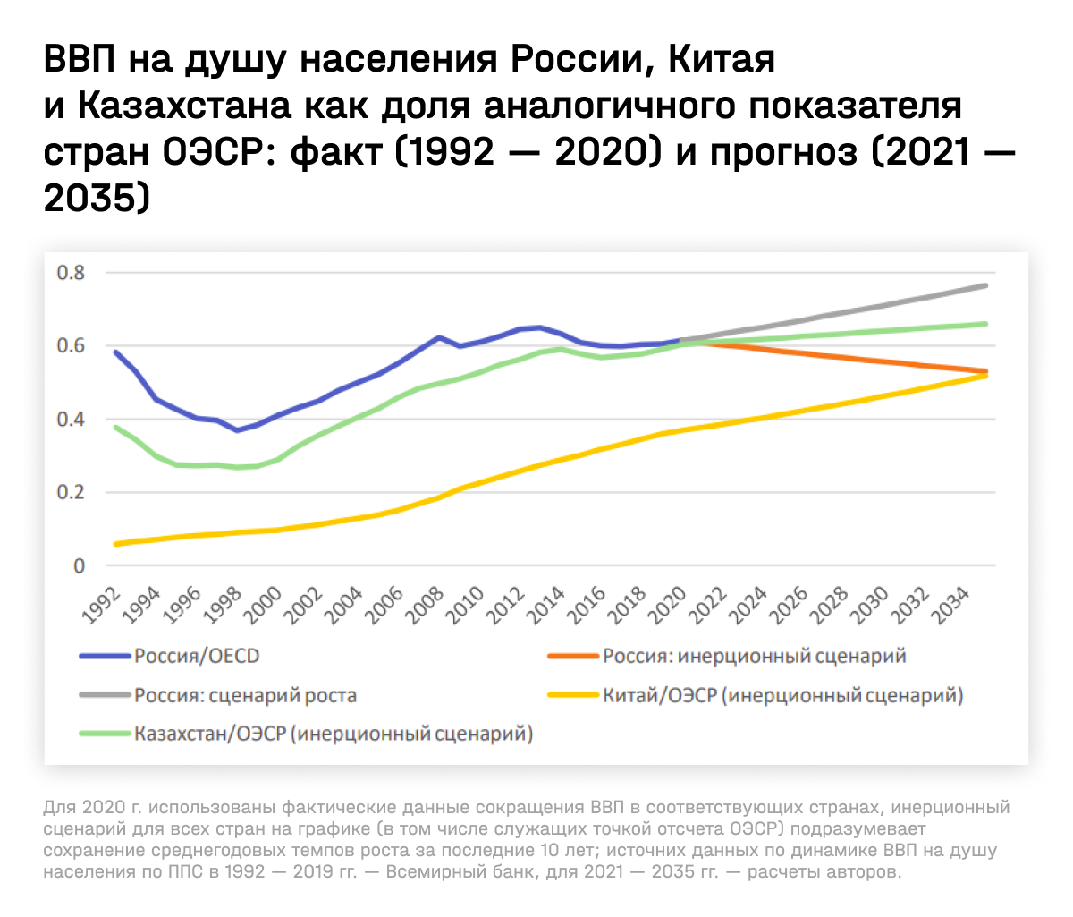 Путинская эпоха застоя (2009–2019) хуже брежневской по средним темпам роста экономики — в среднем 1% в год против 1,6% в советские времена. Это означает снижение доли России в мировой экономике и рост отрыва удельных показателей от развитых и многих развивающихся стран. Россия, прочно застрявшая в ловушке среднего дохода, уже отстает по душевому ВВП (по паритету покупательной способности) от Румынии, ее нагоняет Казахстан, констатируют авторы доклада.