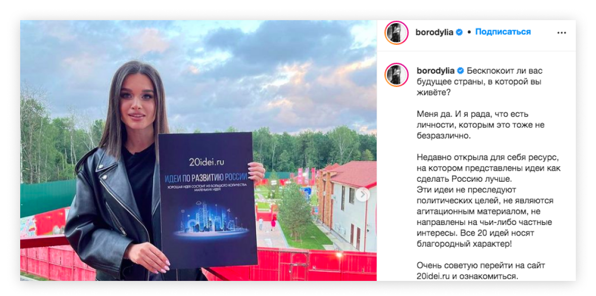 В современной России едва ли можно представить себе проект, который объединил бы звезд масштаба Ольги Бузовой и Тимати, консервативных политологов и экономистов, крупнейшие СМИ страны и влиятельных людей из Одессы. Однако летом 2021-го такой проект появился: «20 идей по развитию России» взялись словно бы из ниоткуда и за три с половиной месяца заполнили все медиапространство. С начала июля авторы «20 идей» опубликовали более 170 рекламных материалов в ведущих онлайн-изданиях и более 1000 рекламных постов у блогеров — и, похоже, не планируют останавливаться. По оценкам The Bell, кампания уже обошлась более чем в 350 млн рублей. Если организаторы не сбавят обороты, годовые расходы на продвижение «20 идей» в сети будут сравнимы с бюджетами «на интернет» таких рекламодателей, как Volkswagen, Nestle и VK.