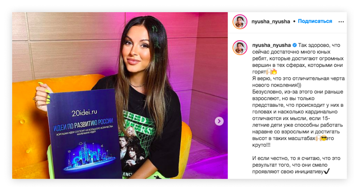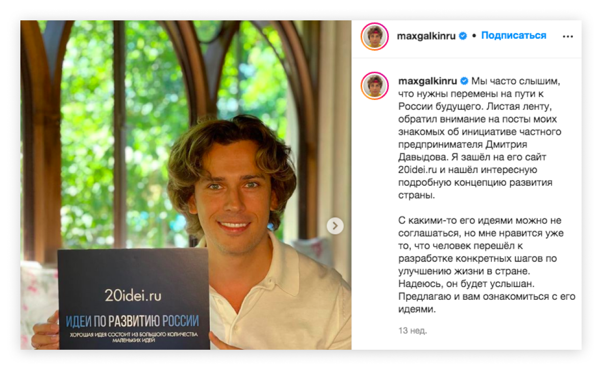 Первые активности заказчиков рекламной кампании «20 идей» в Рунете стали появляться в конце июня — начале июля. Так, по данным аналитического агентства WhoIsBlogger, еще 25 июня проект в формате сторис первым из блогеров поддержал Стас Черкашин (1,3 млн подписчиков в Instagram), а 27-го началась волна публикаций, охватившая самых топовых «инстаграмщиков» страны. Реклама всегда делается по узнаваемому шаблону: звезда держит в руках печатный экземпляр «20 идей» — синюю книгу в твердой обложке — или находится с книгой в одном кадре и сопровождает пост/сторис подписью с советом подписчикам ознакомиться с идеями Дмитрия Давыдова, способными улучшить жизнь в России. Говорить о проекте с The Bell ни один из крупных блогеров, поучаствовавших в кампании, не пожелал.