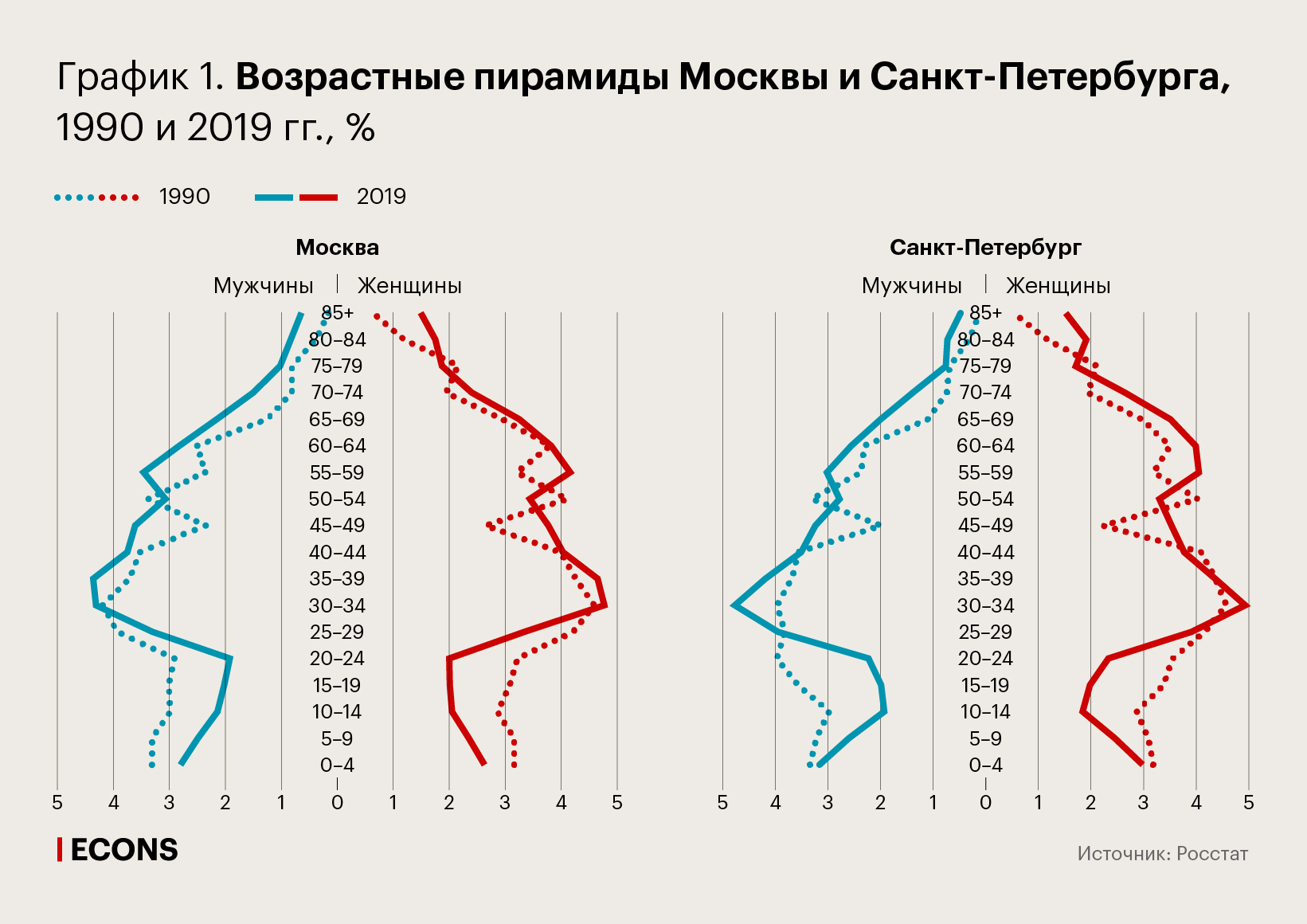 Как и во всем мире, старение населения стремительно набирает силу и в России, где, например, за 1990–2019 гг. общая численность населения сократилась на 0,6%, в то время как число пожилых людей (65+) выросло за это время наполовину. В авангарде российских демографических изменений – крупные города, но самыми быстрыми темпами среди российских мегаполисов «стареют» Москва и Санкт-Петербург. Движущими силами этого процесса являются снижение рождаемости и рост ожидаемой продолжительности жизни в старших возрастах, а также миграция.
