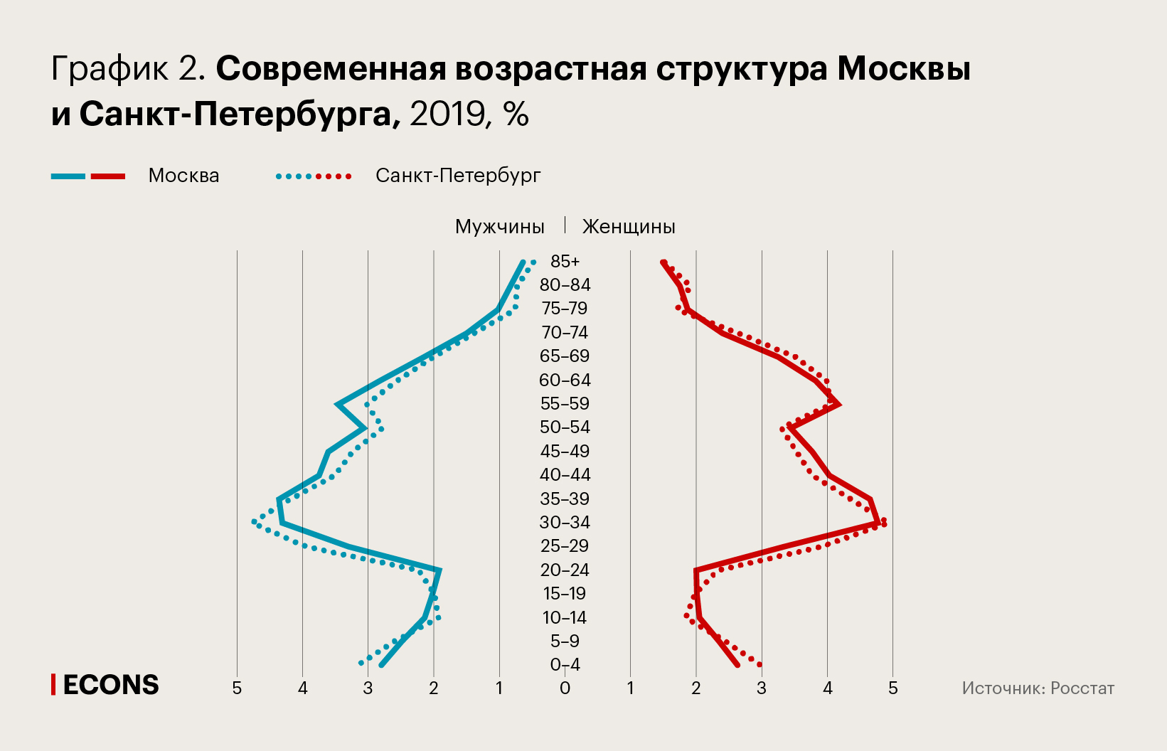 Направление общих демографических тенденций в Москве и Санкт-Петербурге в последние 30 лет принципиально не отличается, но в уровне рождаемости и смертности существуют различия. Например, с 2002 г. суммарный коэффициент рождаемости (число рождений на женщину) в Санкт-Петербурге превосходит значение этого показателя для Москвы. При этом практически для всего рассматриваемого периода ожидаемая продолжительность жизни при рождении в Москве выше, причем с конца 1990-х гг. это расхождение увеличивается. С середины первой декады текущего столетия доля пожилых в общей численности населения и доля детей в обоих городах монотонно растет.