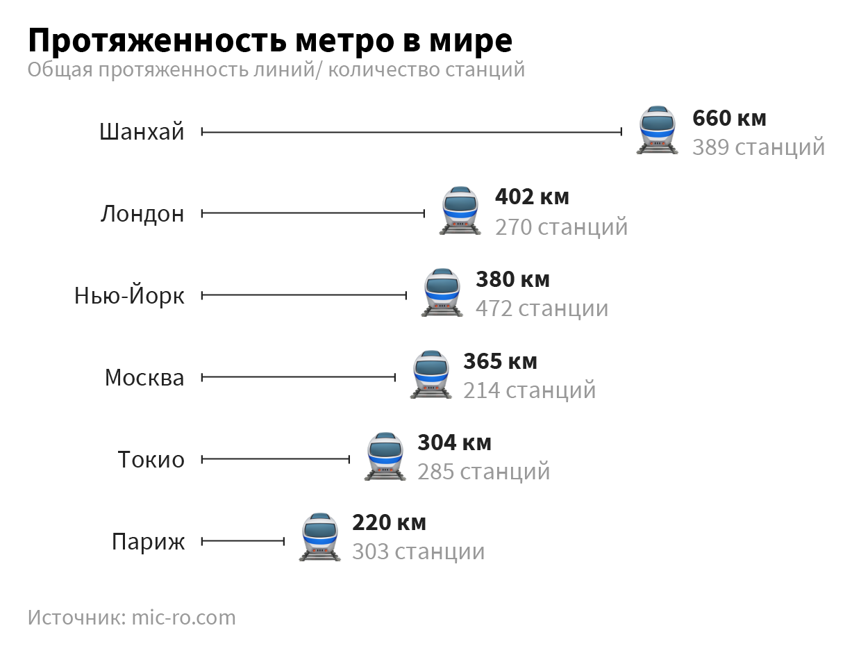 • Уже сейчас московский метрополитен входит в десятку самых крупных в мире, и продолжает расти в среднем на 5 км или 2 новых станции в год.