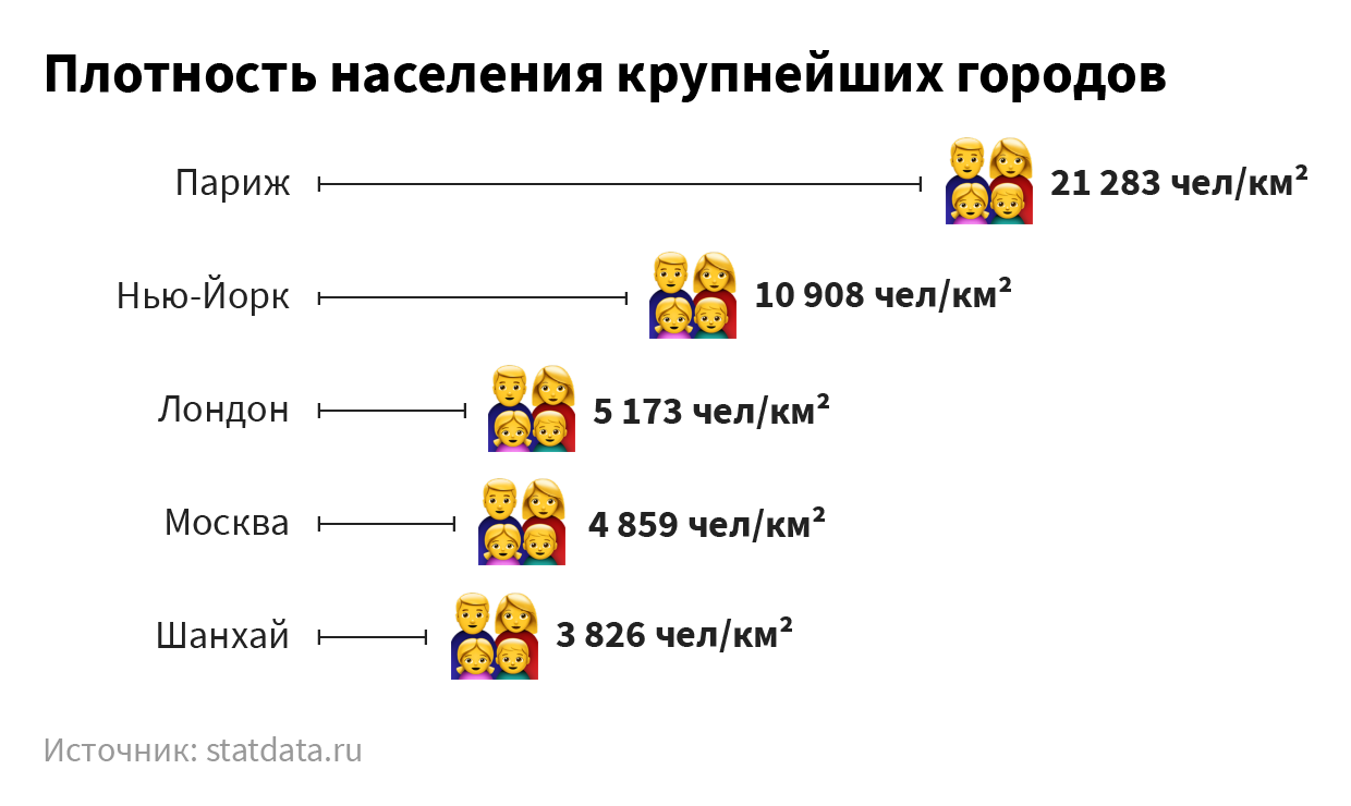 • По численности населения Москва занимает 11 место в мире – в городе живет больше 12 млн человек. И еще 10 млн ежедневно посещают его. Но российская столица достаточно велика, чтобы вмещать такое количество людей: площадь Москвы превышает 2500 км², для сравнения, почти 9 млн жителей Нью-Йорка размещаются всего на 789 км². Такая высокая плотность населения заставляет города буквально расти вверх. Поэтому в Москве небоскребы – пока эксклюзивное украшение города, в отличие от Шанхая или Нью-Йорка, где они – вынужденная реальность.