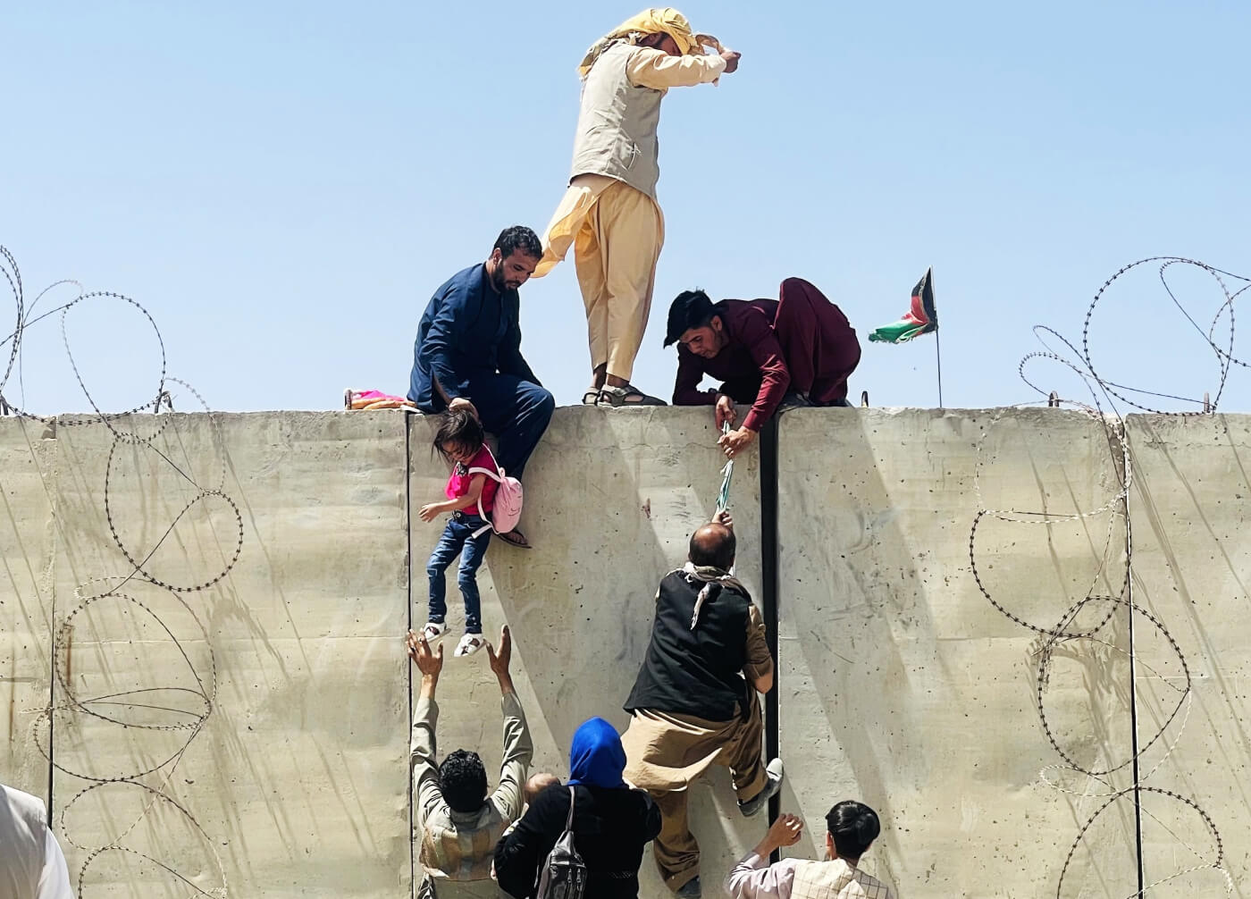 Почти все страны региона закрыли свои сухопутные границы для беженцев из Афганистана. Не стал закрывать границу Иран, согласившись принимать беженцев. Также канцлер Германии Ангела Меркель заявила, что Берлину придется эвакуировать из Афганистана около 10 тысяч человек. На фото: люди перелезают через стены с колючей проволокой, чтобы попасть на территорию аэропорта.