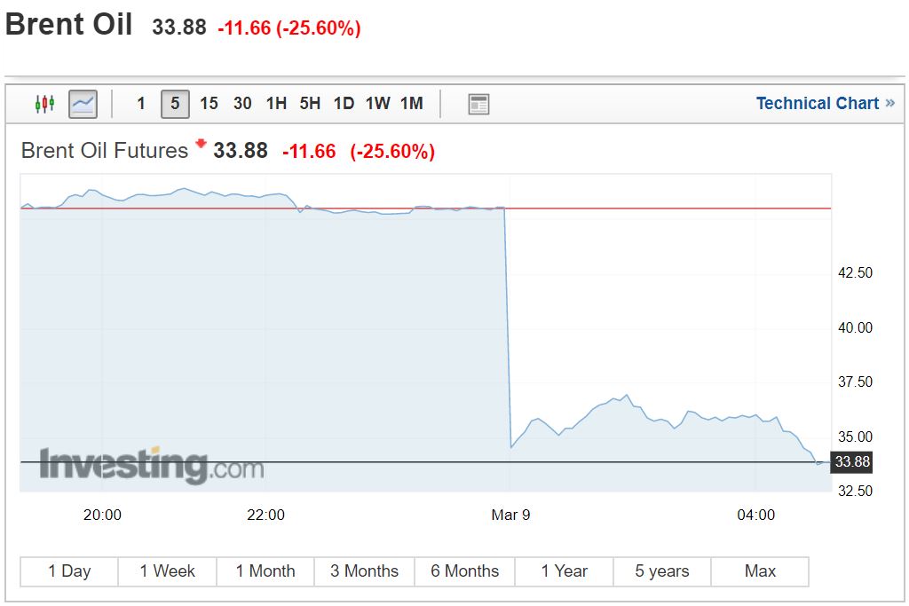 На открытии понедельничных торгов стоимость барреля Brent упала на 30% и доходила до $31,02. К 4:30 мск падение скорректировалось до 25%, а цена — до $34, но обвал остается одним из рекордных в истории нефтяного рынка. Причина — беспрецедентные скидки и обещания роста добычи, на которые Саудовская Аравия пошла после разрыва сделки с Россией.
