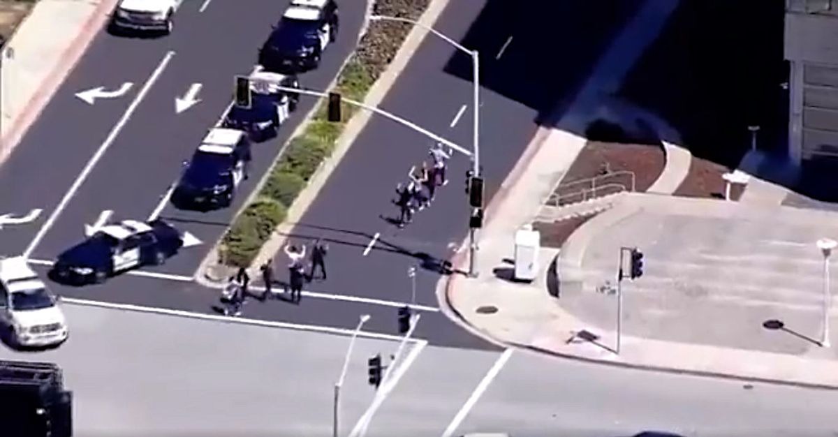 Сотрудники YouTube эвакуируются из здания после стрельбы. Кадр из видеосъемки CBS