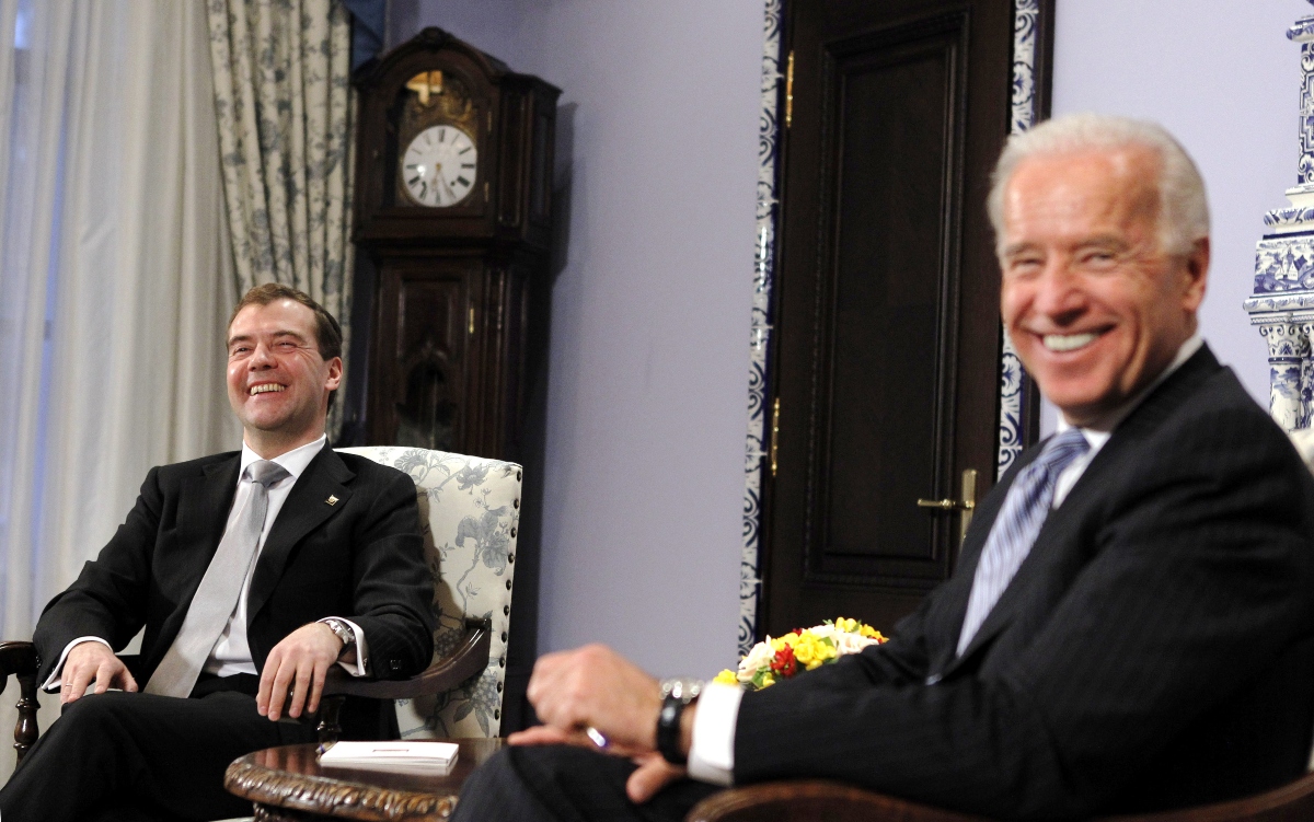 Поначалу Байден выступал за развитие экономических связей с Россией и возглавлял работу над ратификацией нового ядерного соглашения СНВ-3, подписанного в 2010 году. Он же был одним из главных идеологов «перезагрузки» отношений с Россией. Хотя большую кнопку с надписью Peregruzka привозила главе российского МИД Сергею Лаврову Хиллари Клинтон, слова о том, что Россия и США «должны нажать кнопку перезагрузки» в отношениях, первым произнес именно Байден.
