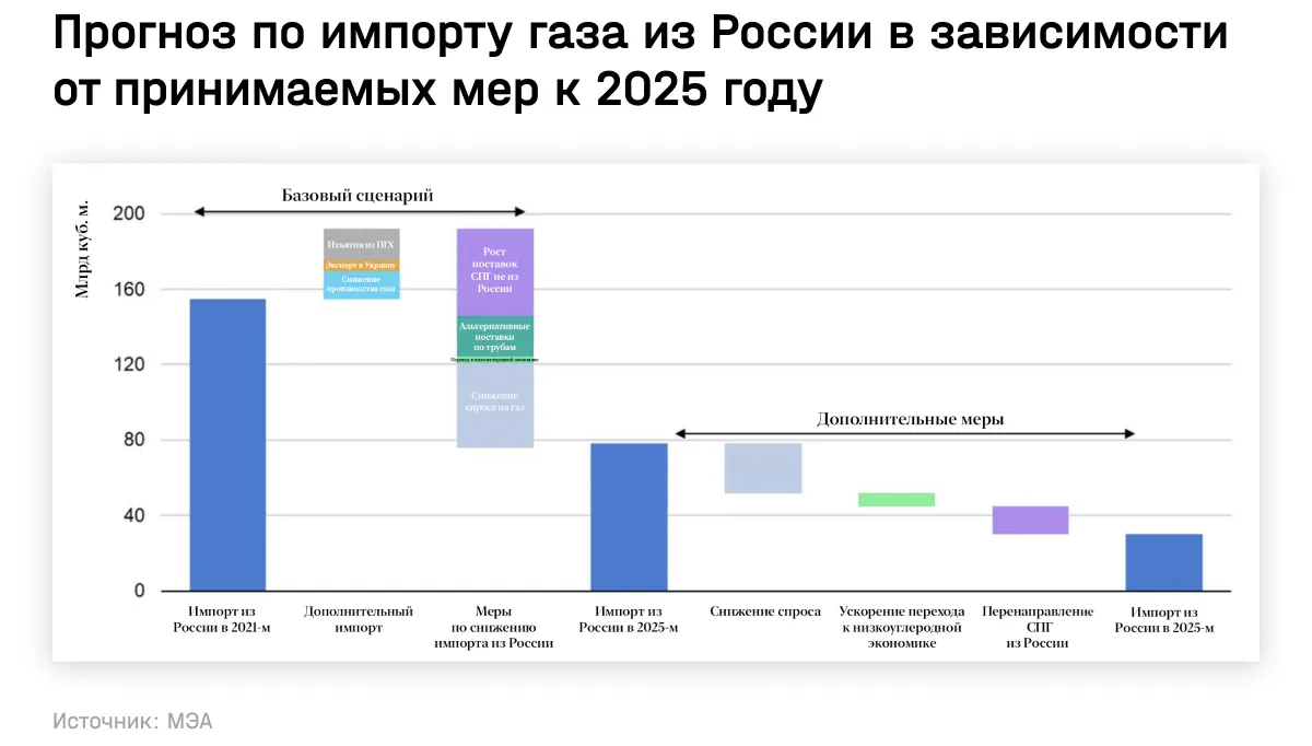 В июньском отчете МЭА анализируются перспективы отказа Европы от российского газа вне экстренных сценариев. Базовый сценарий МЭА основывается на том, что постепенно истекающие долгосрочные контракты «Газпрома» на поставки газа в Европу не будут продлеваться. В этом сценарии импорт из России снизится на 55% по сравнению с 2021 годом, до примерно 70 млрд кубометров. В сценарии более активного замещения российский экспорт в Европу может снизиться до 30 млрд кубометров уже к 2025 году.