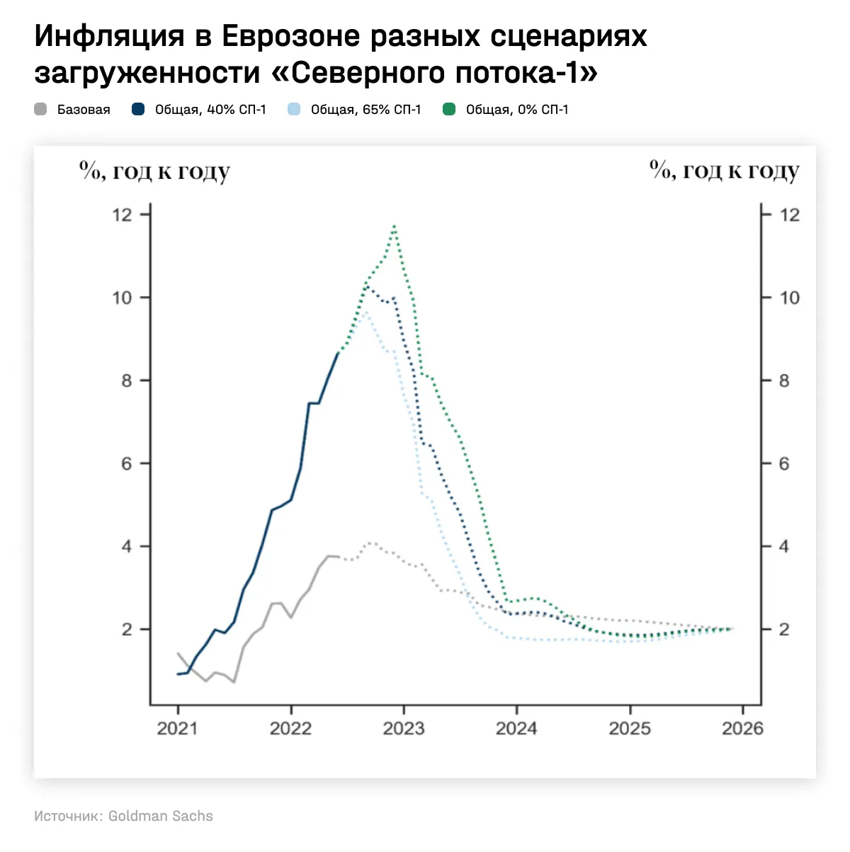 - Дефицит газа приведет к ускорению и без того растущей инфляции. Это может ударить по потребительской уверенности. После снижения прокачки по «Северному потоку — 1» в июне GS повысил прогноз по годовой инфляции в еврозоне до 10,3%.