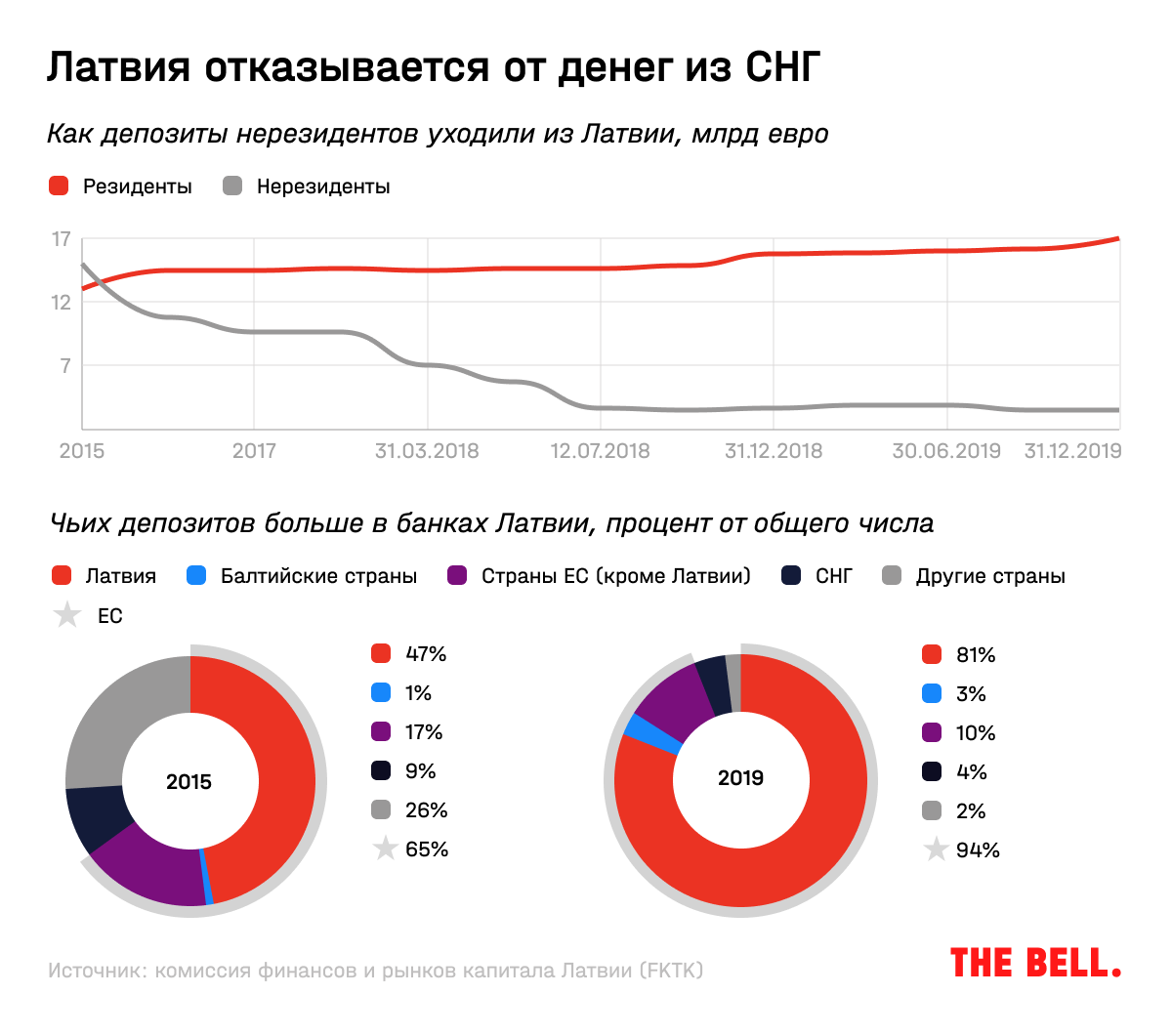 Латвийские банки начали массово отказывать в обслуживании тем, у кого нет реальной связи со страной. Из самого ABLV вкладчики вынесли в итоге около €600 млн. Только за февраль—июль 2018 года нерезиденты забрали из всех латвийских банков 4,8 млрд евро. Всего, по статистике комиссии по финансам и рынкам капитала, за 2015–2019 годы объем иностранных депозитов в Латвии сократился на 74%. А их доля в общем объеме депозитов упала с 53,4% до 18,8%. Доля депозитов клиентов из СНГ за тот же период сократилась с 9% до 4%.
