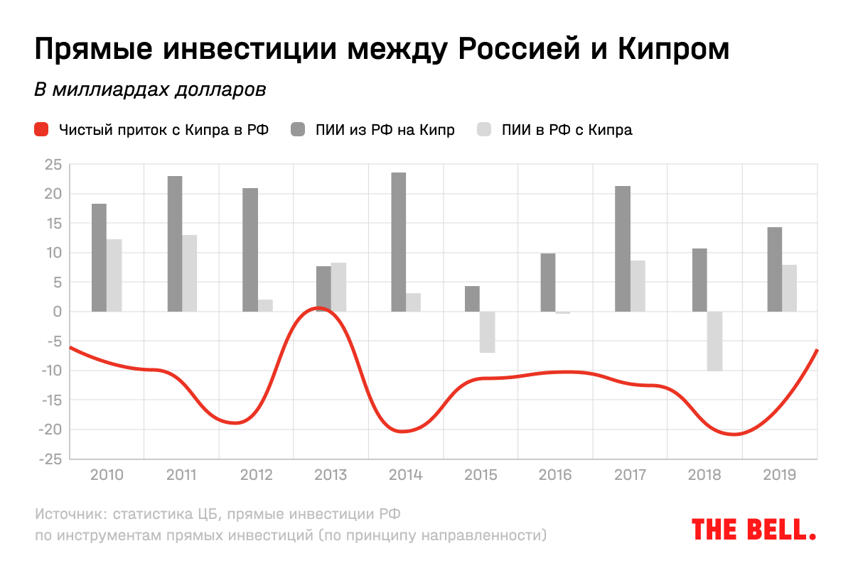 Объем российских денег, которые уходят на Кипр, за первую пятилетку 2010-х был немного выше, чем за вторую, следует из статистики регулятора. Но у инвестиций в Кипр и офшоры в целом есть специфика, отмечали аналитики ЦБ. Раньше большой отток средств в них компенсировался SPV-сделками (то есть проведенными через компании, созданными специально под конкретную сделку, — special purpose vehicle). До санкций и госкампании по деофшоризации от 60 до 80% ПИИ в Россию приходилось на офшоры, куда они до этого попали из России же, писал в 2017 году экономист РАН Борис Хейфец. В 2019 году МВФ оценил (.pdf) долю «фантомных» иностранных инвестиций в Россию — то есть никаких не зарубежных, а российских по происхождению — в 50%.
