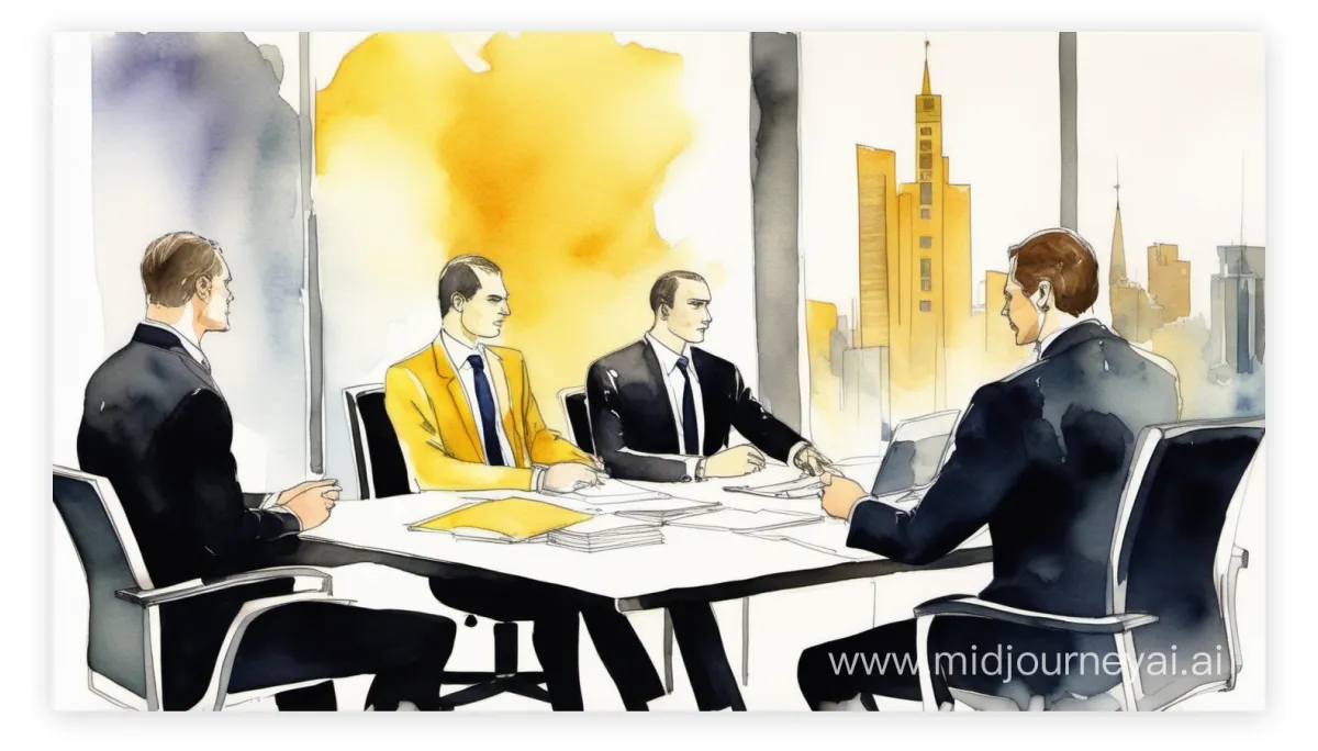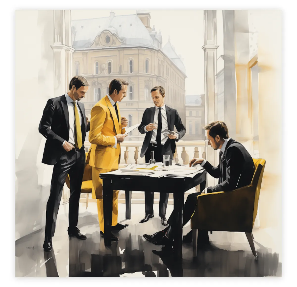 Пример: four businessmen, meeting, watercolor illustration, office of a Russian IT holding, Moscow outside in winter, interior photography, analog, daylight, yellow and black, business suits, Vogue style.
