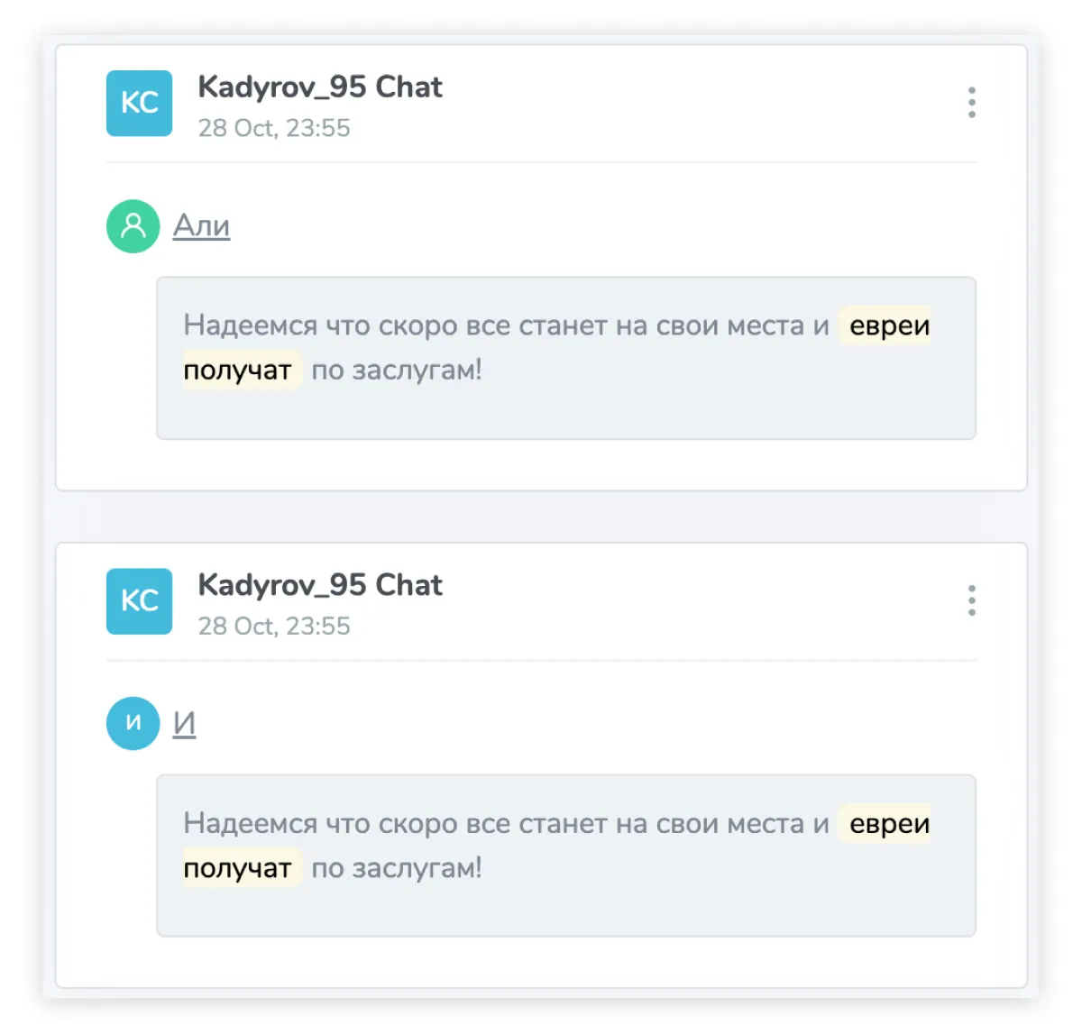 Фильтр «точное совпадение» позволяет проверить, транслировали ли боты одну и ту же мысль в разных чатах. Например, вы выяснили, что фраза «евреи получат по заслугам» на протяжении нескольких дней перед погромом в Дагестане вбрасывалась разными пользователями в чаты при телеграм-канале Рамзана Кадырова и другие провоенные чаты вроде «Риадовки».