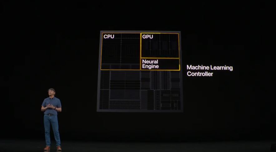 Здесь у Apple неожиданная ступенька в презентации — они рассказывают об устройстве уже заявленного процессора A13 Bionic, говоря о низком энергопотреблении и модуле для машинного обучения.