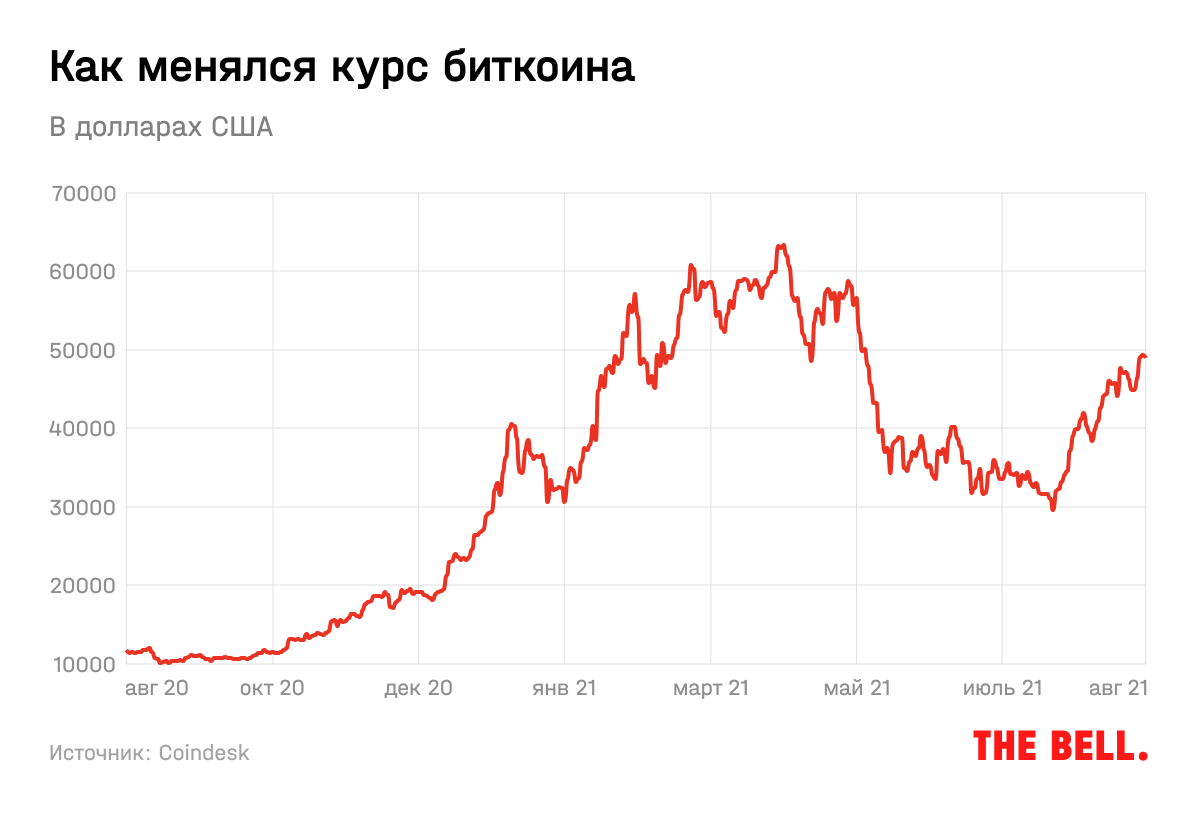 Новости об интересе крупных инвесторов способствовали росту биткоина и в июле-августе. За последние 10 дней июля криптовалюта выросла с $29 600 до $41 200. Старт росту дала криптовалютная конференция The B Word Conference 22 июля, на которой в поддержку биткоина высказались Илон Маск, глава Twitter Джек Дорси и основатель инвесткомпании ARK Invest Кэтрин Вуд — кумир частных инвесторов из приложения Robinhood. А в конце июля биткоин резко вырос из-за публикации на сайте Amazon вакансии ведущего специалиста по цифровым валютам и блокчейну. Инвесторы подумали, что Amazon готовится налаживать оплату биткоинами (позже компания это опровергла).