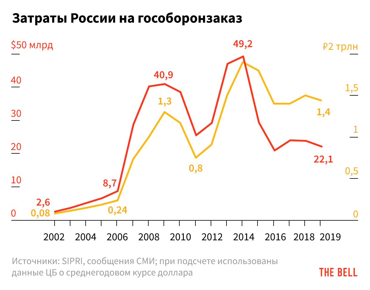 Россия начало резко наращивать гособоронзаказ в 2007 году, когда министром обороны был назначен Анатолий Сердюков, обещавший реформировать армию и поставить на вооружение новейшую технику. Протесты против аппетитов Сердюкова в итоге стали одной из главных причин отставки в 2011 году министра финансов Алексея Кудрина.