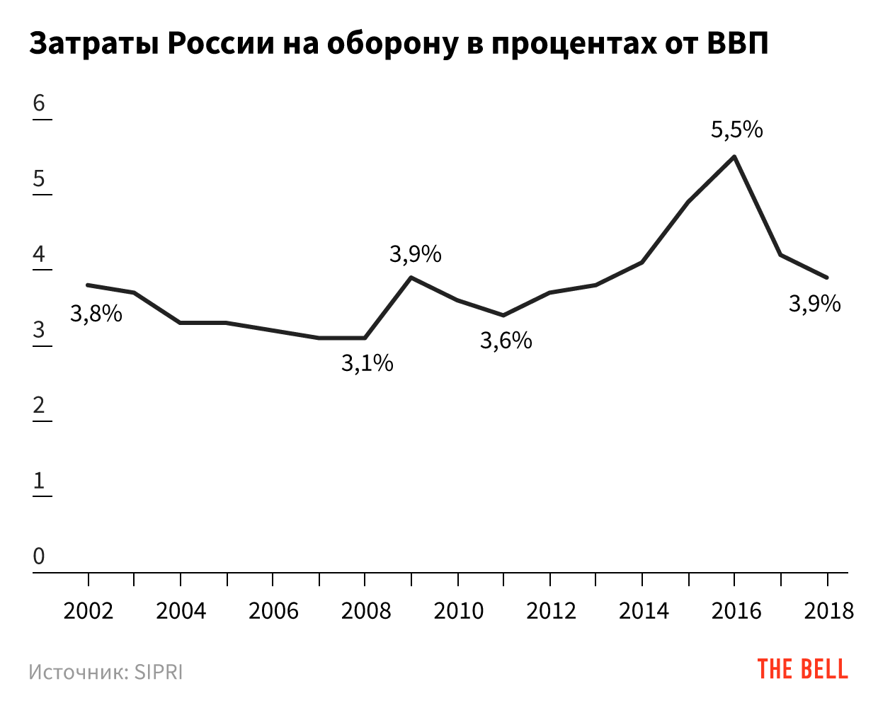 Пик нагрузки военных расходов на экономику страны пришелся на посткрымский период: 5,5% и даже 3,9% ВВП — это много: меньше в процентном отношении тратят и США, и Китай.