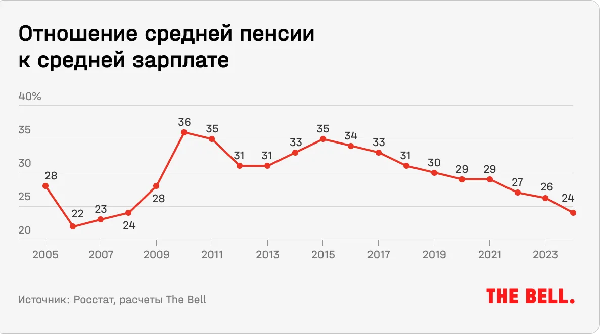 Растет и разрыв между пенсиями и зарплатами. В развитых экономиках это важный показатель, который демонстрирует «щедрость» пенсионной системы. Ее принято оценивать с помощью так называемого коэффициента замещения, который показывает долю средней пенсии от доли средней зарплаты. И сейчас этот показатель в России сокращается гораздо быстрее, чем раньше. За период с 2014 по 2021 год он снизился с 33% до 29%, а на конец 2024 года составлял уже 24%.