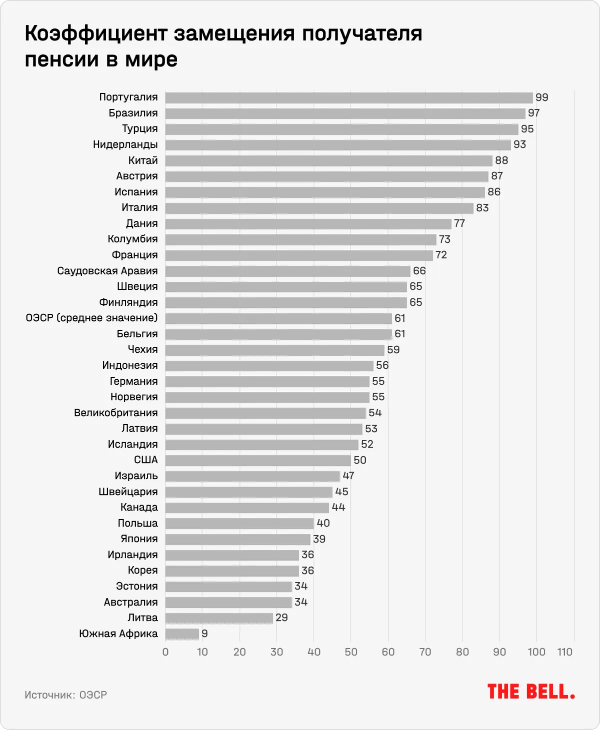 Для сравнения, в среднем по Европе в 2023 году этот показатель составлял 68%, а по странам ОЭСР — 61%. Из развитых экономик самый большой коэффициент замещения — в Португалии, Бразилии, Турции и Нидерландах, а самый низкий — в Литве, Австралии, Эстонии и Южной Корее.