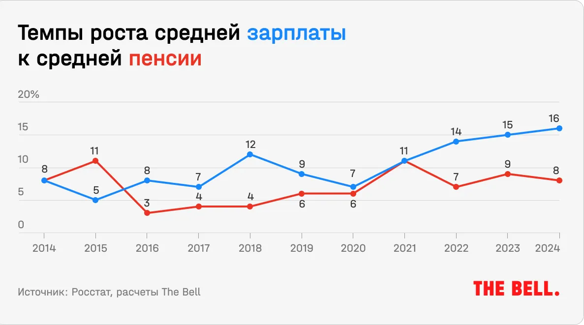 Послевоенный кризис на рынке труда привел к зарплатной гонке: средняя зарплата в России выросла почти в два раза — с 57 200 в 2021 году до 89 000 рублей в 2024-м. Но российским пенсионерам, которые в большей степени по сравнению с другими возрастными группами поддерживают войну, повезло куда меньше.