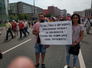 - Пенсионеры же, наоборот, объясняли свое появление на митинге заботой о молодом поколении. «Скажите на милость, почему молодежь и их родители должны столько работать? Почему? Наши сыновья год не дожили до пенсии! Год! А куда делись их накопления? Что они с ними сделали?», – объяснила корреспонденту The Bell пенсионерка в возрасте под 80 лет, которая пришла на акцию вместе с подругой.