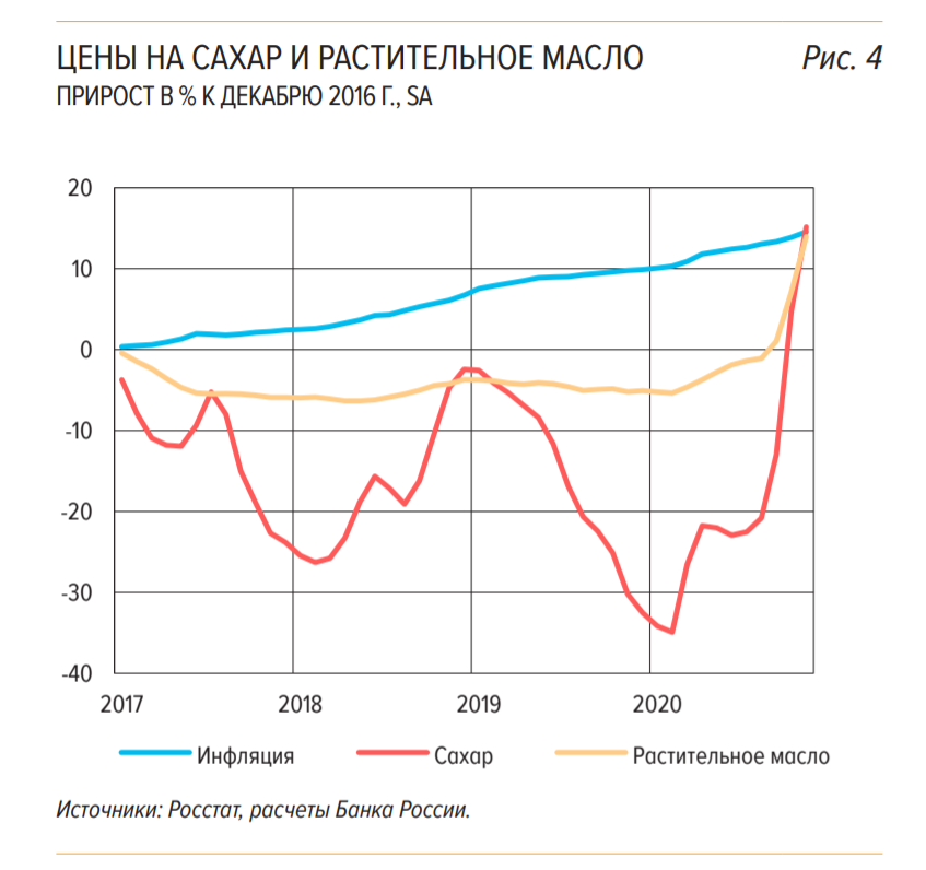 Главный экономист «Эксперт РА» Антон Табах напоминает: те цены, которые собирается регулировать правительство, выросли сильно только в последние месяцы, а в предыдущие годы, когда все дорожало, они не росли и даже дешевели. Telegram-канал MMI, основанный директором департамента денежно-кредитной политики ЦБ Кириллом Тремасовым, привел график из последнего обзора ЦБ по инфляции, из которого видно, что и сахар, и подсолнечное масло последние три года с учетом инфляции снижались — а сейчас лишь догнали общую инфляцию.