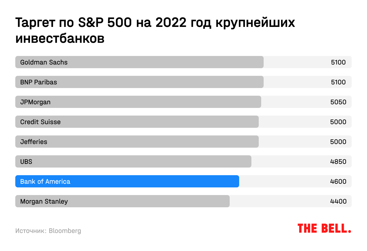 По прогнозу BofA, индекс S&P 500 к концу года составит 4600 пунктов (всего на 1,6% больше, чем сейчас). Это один из самых пессимистичных прогнозов среди всех крупных инвестбанков. К примеру, таргет Goldman Sachs (GS), об отчете которого мы подробно рассказывали здесь, — 5100 пунктов.