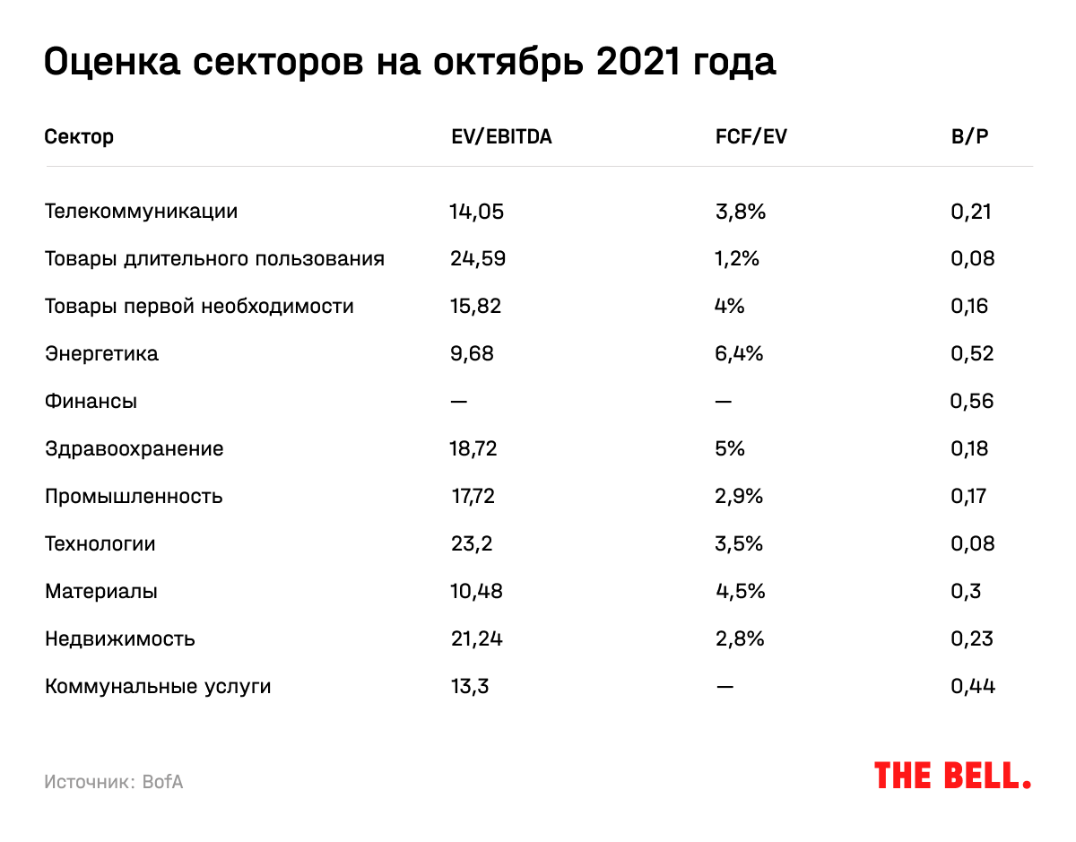 По данным на октябрь 2020-го, наиболее недооценены по EV к EBITDA сектора энергетики и материалов, по FCF/EV — энергетика и здравоохранение, а по B/P — энергетика и финансы. Выбирая отдельные компании, вероятно, стоит сравнивать их с отраслевыми показателями.