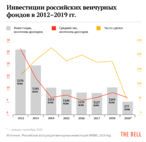До 2017 года включительно объем венчурного рынка сокращался. Лишь в 2018 году был зафиксирован рост. В исследовании, заказанном Российской венчурной компанией (РВК), говорится, что в 2018 году инвесторы вложили в российские стартапы более 26,7 млрд рублей — на 10,4 млрд больше, чем годом ранее. Но из 275 сделок только 28 совершили частные российские фонды. Общий объем их инвестиций — всего 1,5 млрд рублей. Крупнейшими инвесторами оказались корпорации (8,6 млрд рублей в 2018 году) и госфонды (1,8 млрд рублей).