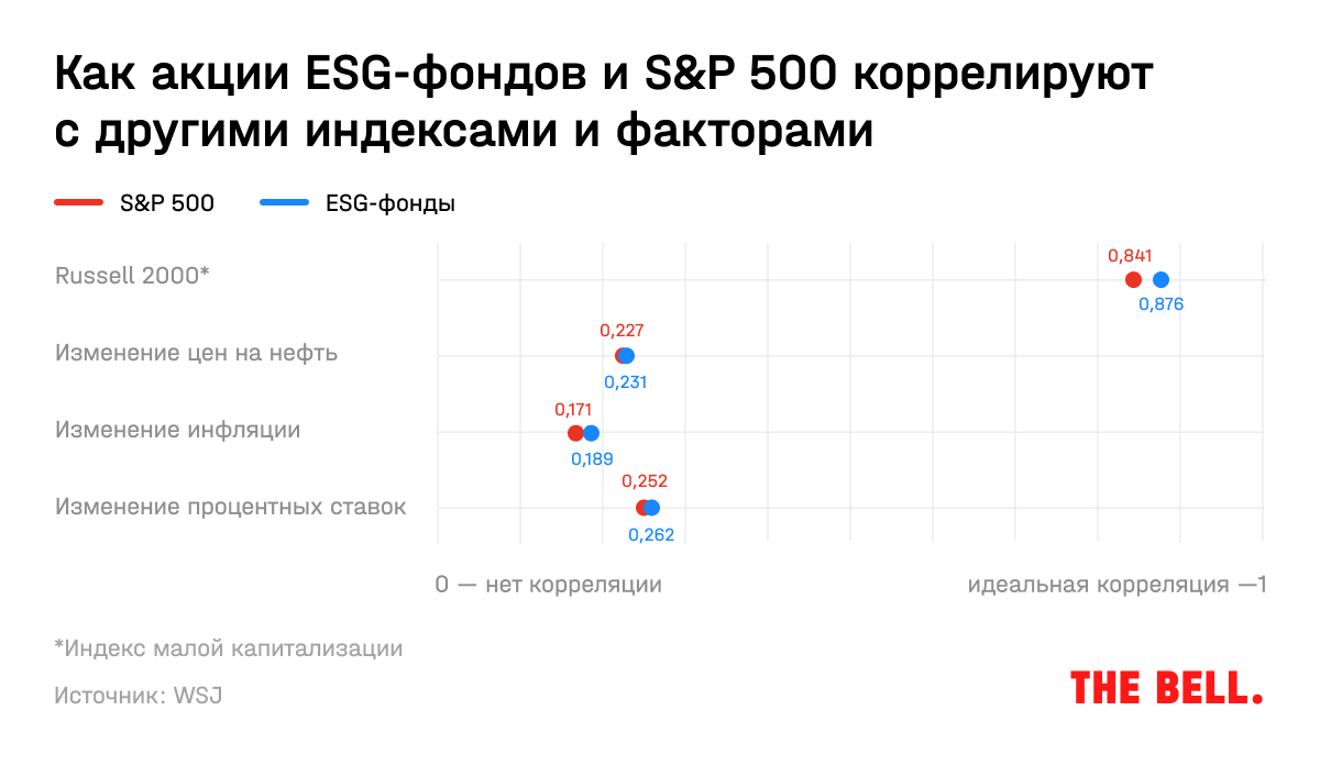 Хорстмейер сравнил месячную доходность ESG-фондов, а также фондов со словами «устойчивый» (Sustainable) или «влияние» (Impact) в названии за 20 лет и ее корреляцию с ценами на нефть, инфляцией и краткосрочными процентными ставками. То же самое он сделал с индексом S&P 500, а затем сравнил результаты.