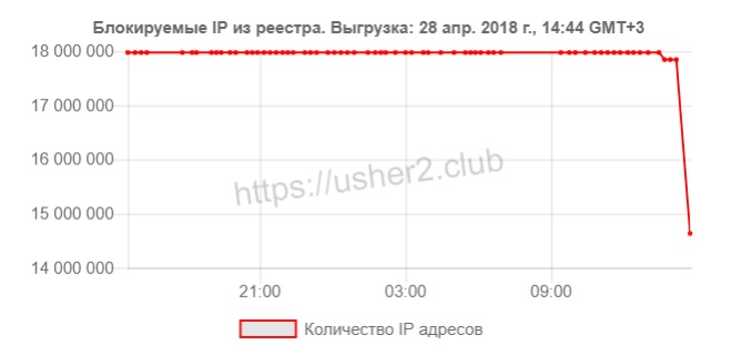 Роскомнадзор в субботу днем разблокировал примерно 3 млн IP-адресов (это 17% от общей массы заблокированных адресов), свидетельствуют данные выгрузок из реестра регулятора (источники: 1, 2).