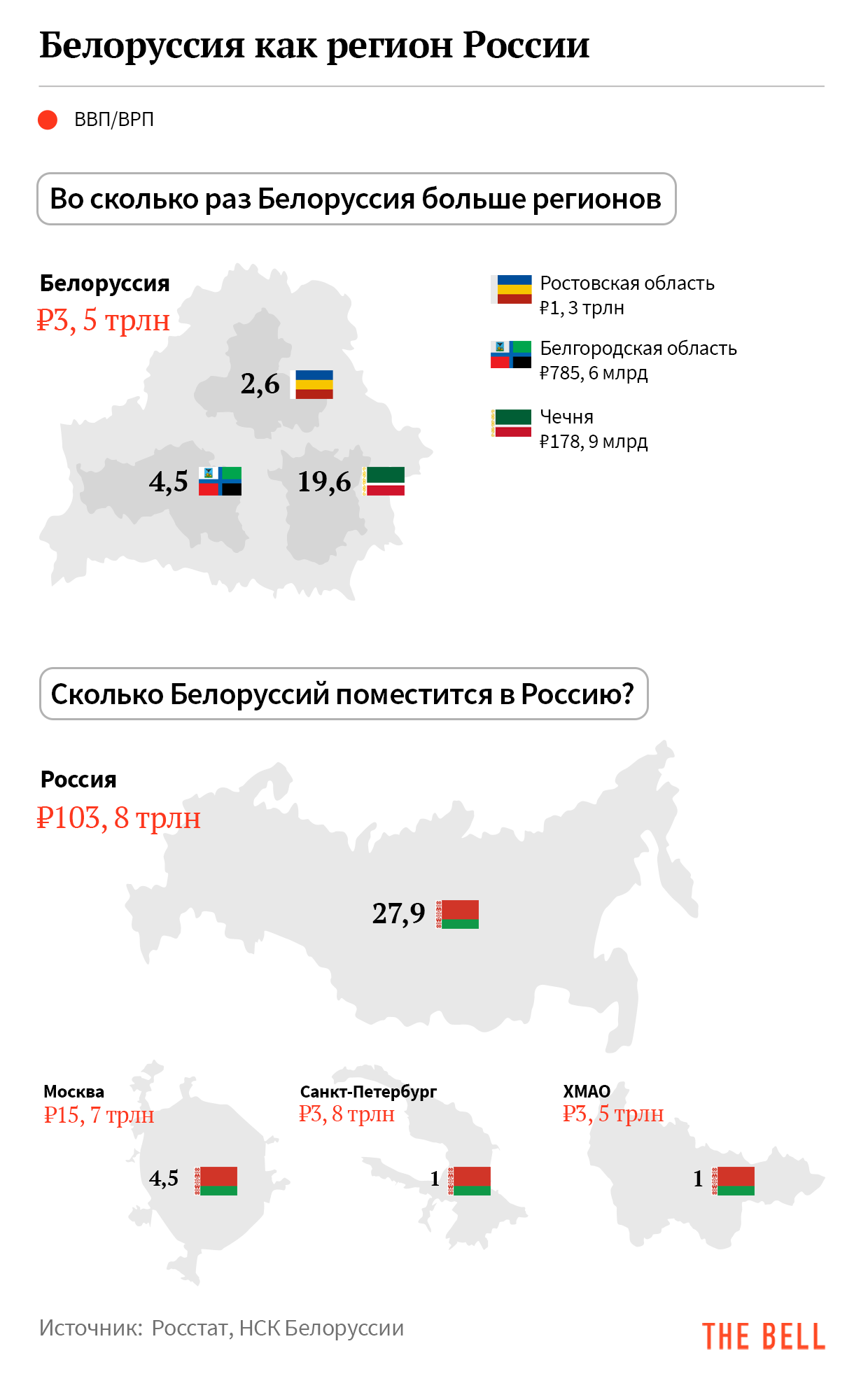 Пока разница только в том, что регионы не только получают всевозможные дотации и субсидии, но и приносят деньги в федеральный бюджет, а Белоруссия получает поддержку, не пополняя бюджет, заключает Салихов. Так что выгоды скорее политические. Почитать о них можно тут