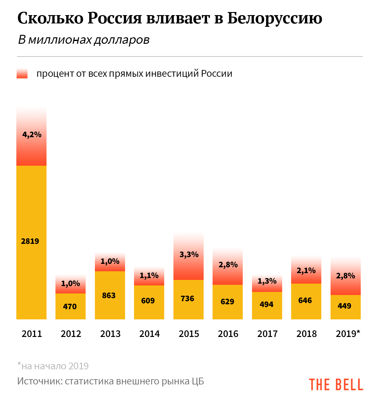 • Только прямые российские инвестиции в 2011–2019 годах, согласно данным ЦБ, составили почти $8 млрд. Но постепенно объем поддержки снижается. Если в 2011 году на Белоруссию приходилось 4,2% всех прямых инвестиций России, то в 2018-м — всего 2,1%.