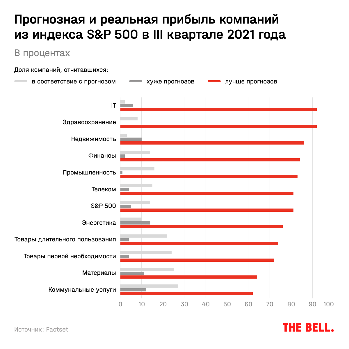 Из 92% компаний из индекса S&P 500, отчитавшихся к 12 ноября, 81% превзошли ожидания аналитиков по прибыли на одну акцию (Earnings per share, EPS), следует из данных Factset. Этот показатель меньше, чем в первые два квартала 2021-го, когда экономика активно восстанавливалась, но даже с таким результатом завершившийся квартал может войти в топ-5 с момента начала подсчетов в 2008 году. В среднем компании обошли прогнозные EPS на 10,1%, а чаще всего приятно удивляли аналитиков игроки их секторов здравоохранения, IT и недвижимости.
