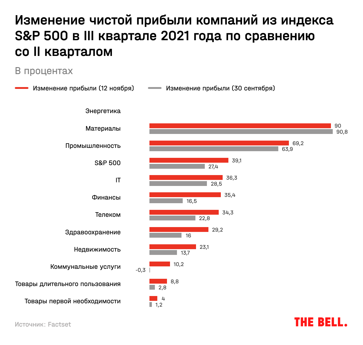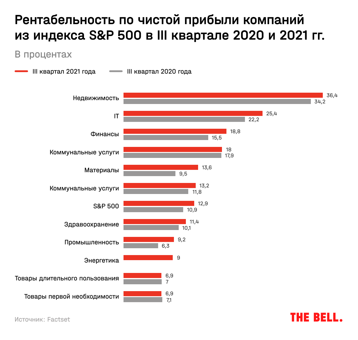 Как результат: хоть смешанная рентабельность по чистой прибыли компаний и снизилась с рекордных 13,1% во II квартале 2021-го до 12,9%, она все равно может стать второй по величине с начала подсчетов.  Всего девять из 11 секторов улучшили свои показатели по рентабельности по сравнению с третьим кварталом 2020-го, и все 11 отчитались по нему лучше среднего за 5 лет.
