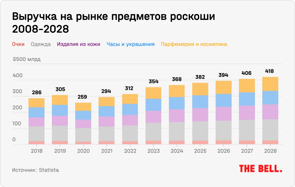 Рынок люкса не полностью независим от ситуации в экономике: пандемийный 2020 год ударил и по нему. Однако после снятия ограничений индустрия начала стремительно восстанавливаться, а по итогам 2022 года превысила допандемийный уровень. По оценкам Statista, за последний год рынок предметов личной роскоши увеличился на 6,3% и достиг $312 млрд.