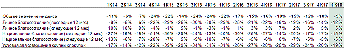 • А в следующий раз раскрыл его значение только в 2019 году: оказалось, что во втором квартале 2019 года по отношению к первому кварталу того же года «индекс настроений потребителей снова подрос, с минус 22% до минус 21%» .