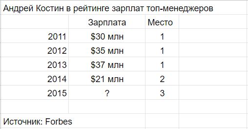 Как на самом деле. Костин всегда был одним из самых высокооплачиваемых российских топ-менеджеров. В соответствующем рейтинге Forbes (выпускался с 2011 по 2016 год) Костин три года подряд занимал первое место и никогда не покидал топ-3. До 2015 года его зарплата составляла не меньше $30 млн и только после девальвации рубля упала до $21 млн.