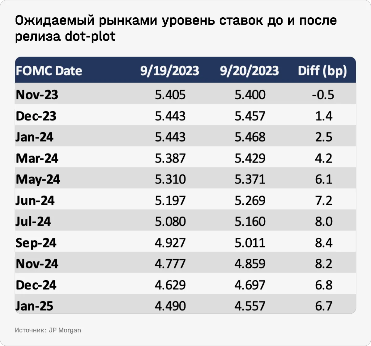 Наглядно о том, как поменялись ожидания по ставкам сразу после публикации dot plot (но до пресс-конференции Джерома Пауэлла), — в отчете JP Morgan (есть у The Bell).