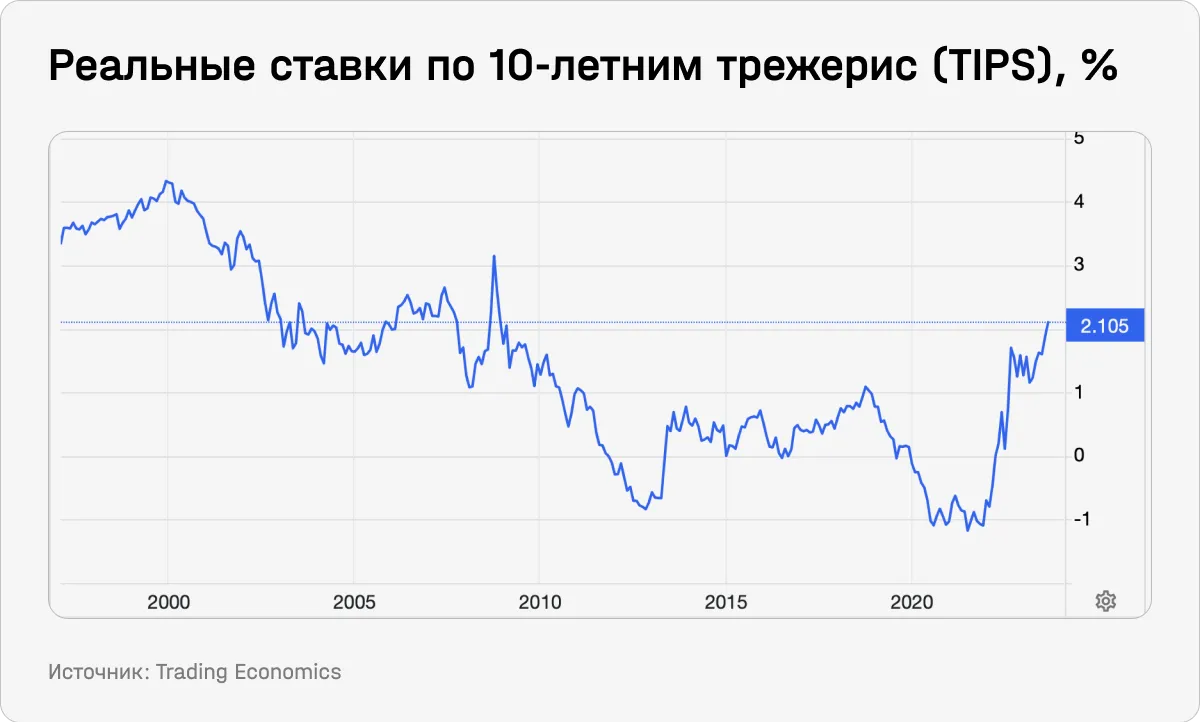 Реальные ставки по 10-летним трежерис (TIPS) также впервые с 2009-го превысили 2%.
