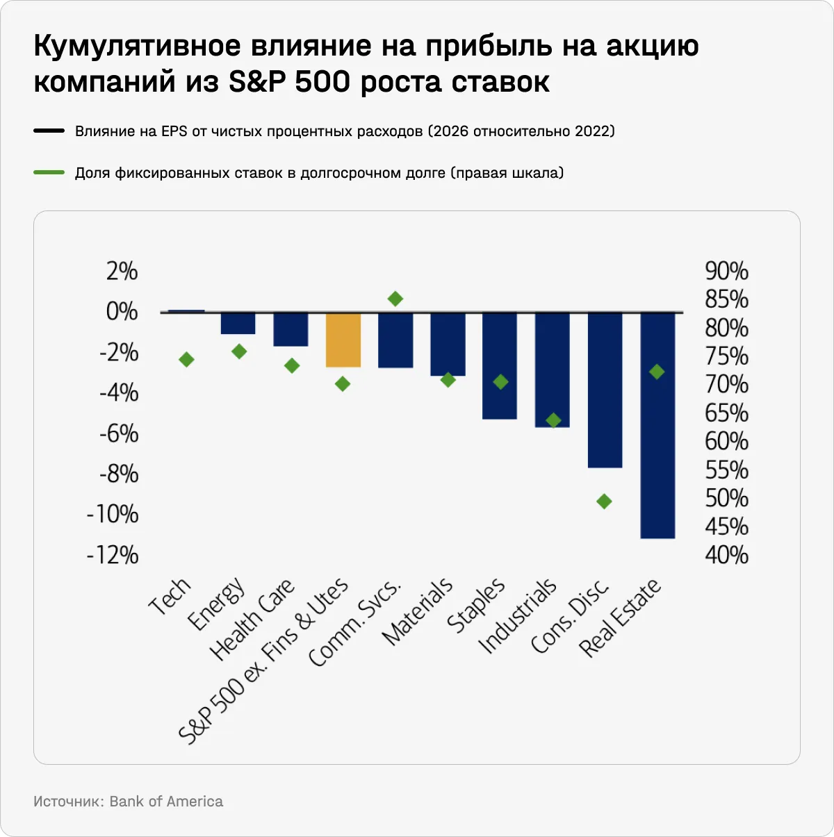 Хорошая новость: эффективная ставка по долгу для компаний из индекса S&P 500 начала расти, но пока она вернулась только на доковидный уровень. Кроме того, компании получают гораздо более высокий процентный доход от свободных денежных средств, что смягчает влияние более высоких процентных расходов. Даже если предположить, что стоимость долга к 2026 году составит ~7%, совокупное влияние на прибыль на акцию S&P 500 составит всего –3% (если исключить сектора финансов и коммунальных услуг).