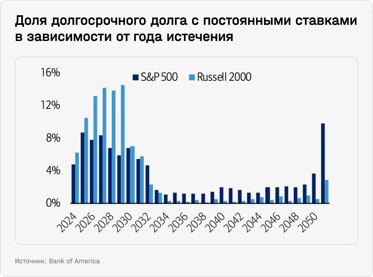 Реальный риск приближения к «стене (или обрыву) погашений» долга — у компаний из индекса Russell 2000, куда также входят компании средней и малой капитализации. График погашения их долгов смещен гораздо ближе к текущему моменту. Только 60% их долгосрочного долга выплачивается по фиксированным ставкам.