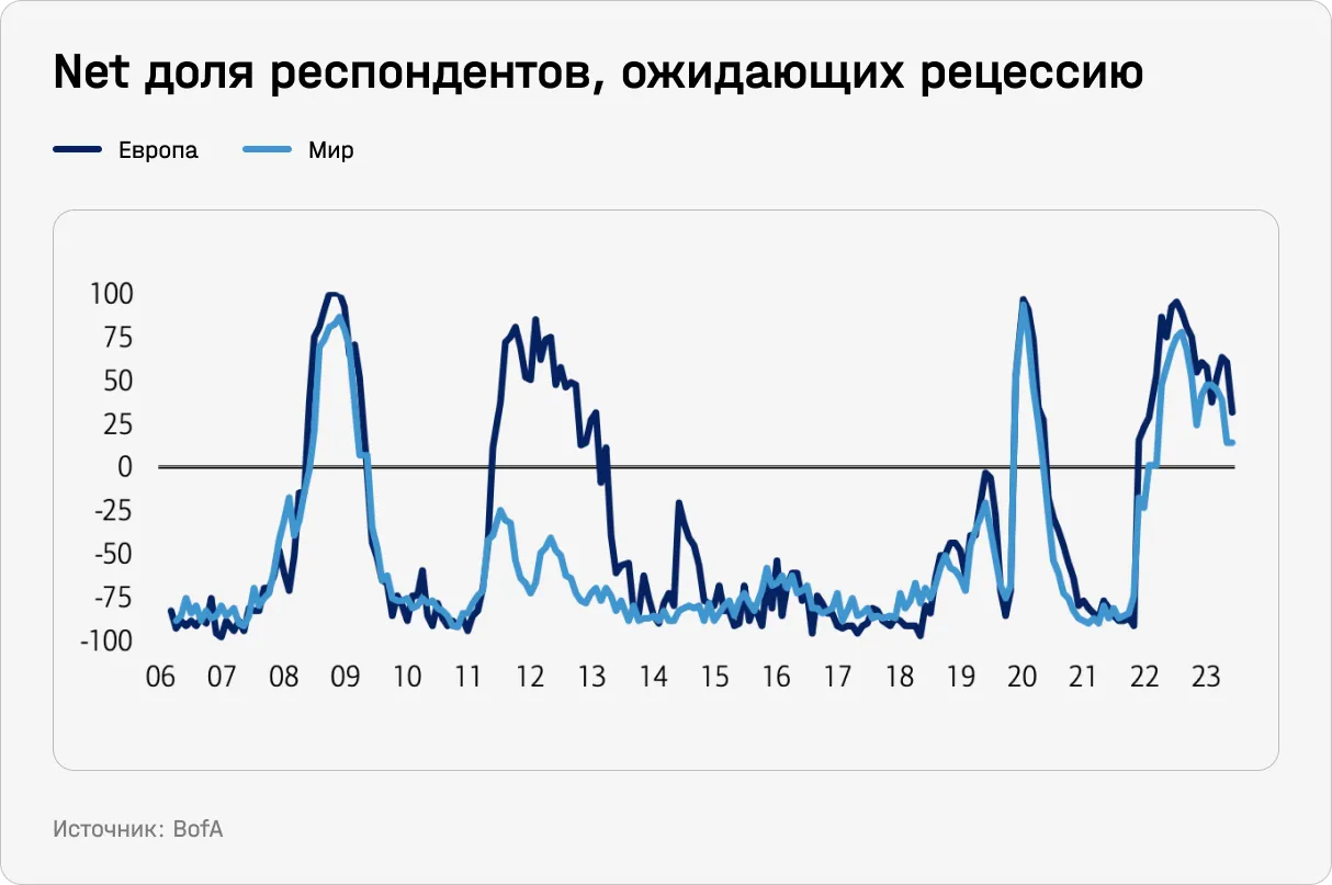 Оптимизм инвесторов по поводу европейских экономик и акций растет, показал опрос управляющих, проведенный Bank of America с 1 по 7 сентября (отчет с результатами есть у The Bell). Только 32% опрошенных (net) европейских управляющих считают, что в ближайшие 12 месяцев европейская экономика окажется в рецессии, против 61% месяцем ранее и 95% в октябре прошлого года. 61% респондентов против 45% в прошлом месяце считает, что за этот период европейские акции вырастут.